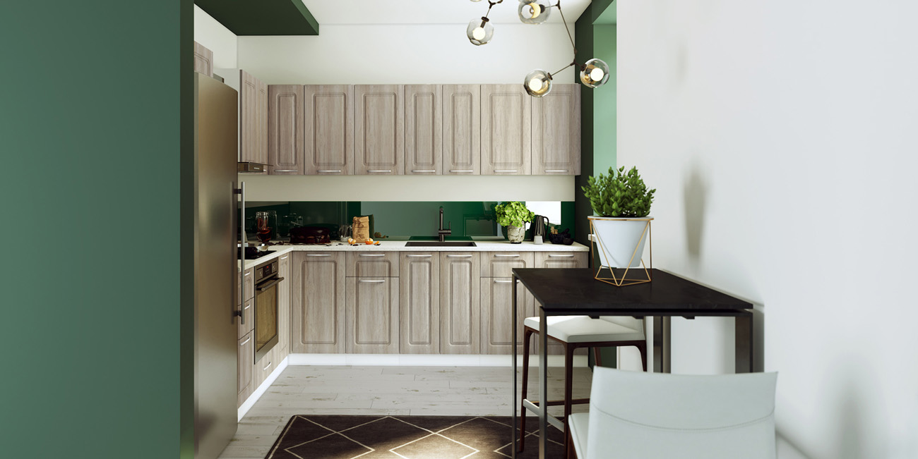 В тясната кухня в коридора, използването на всяко налично място е ключово. Горните шкафове, стигащи до тавана, предлагат голям обем за съхранение без да заемат допълнително място на пода. По този начин се максимизира функционалността на стаята, като едновременно с това се поддържа организираност и чистота.