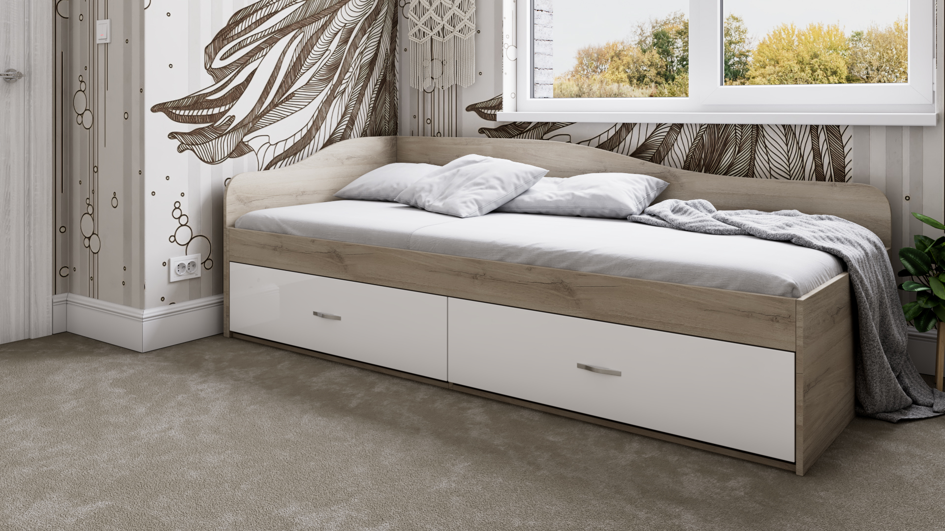 • двойно чекмедже за съхранение – оборудвано е с две удобни чекмеджета в долната част, които предоставят достатъчно място за съхранение на дрехи, завивки или лични вещи. Те улесняват поддържането на ред в стаята, като скриват вещите извън поглед;