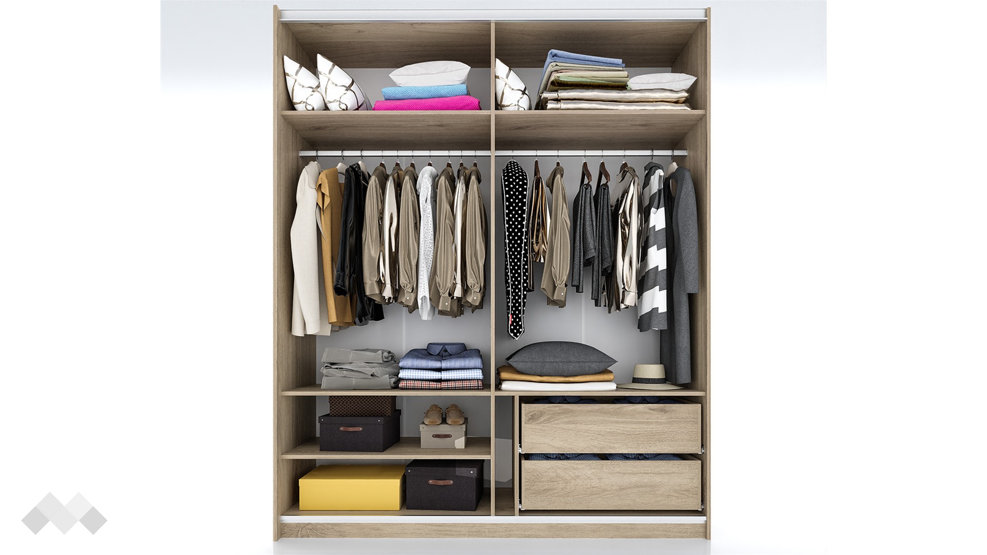 Гардеробът Аделаида е практично разпределен и изцяло отговаря на съвременните стандарти за съхранение на дрехи. На твое разположение са четири просторни рафта, на които можеш да подредиш сгънати дрехи, завивки, възглавници, аксесоари или други необходими за теб вещи. Не сме забравили и лоста за закачалки – тук са цели два, по един за всяко крило, на които можеш да закачиш палта, по-обемни връхни дрехи или елегантното облекло, което се мачка лесно. В тази мебел ще намериш и две вградени чекмеджета, които допринасят за функционалността му.