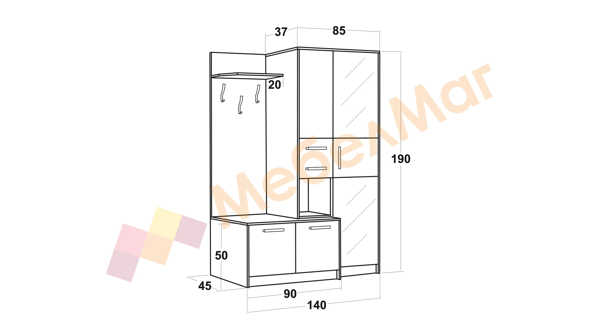 ✓ еднокрилен гардероб с огледало ✓ затворен шкаф с 2 вратички ✓ чекмедже ✓ 3 закачалки ✓ шкаф с вратичка ✓ отворен шкаф ✓ отворен рафт ✓ модерна цветова комбинация ✓ 16 мм ПДЧ