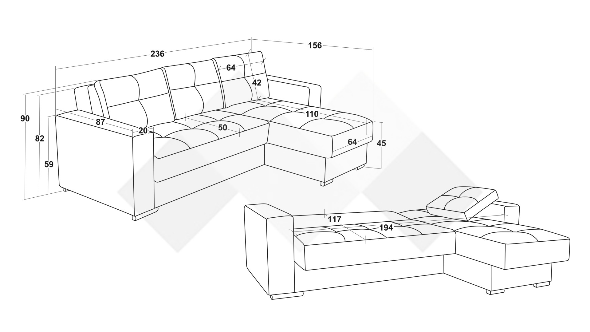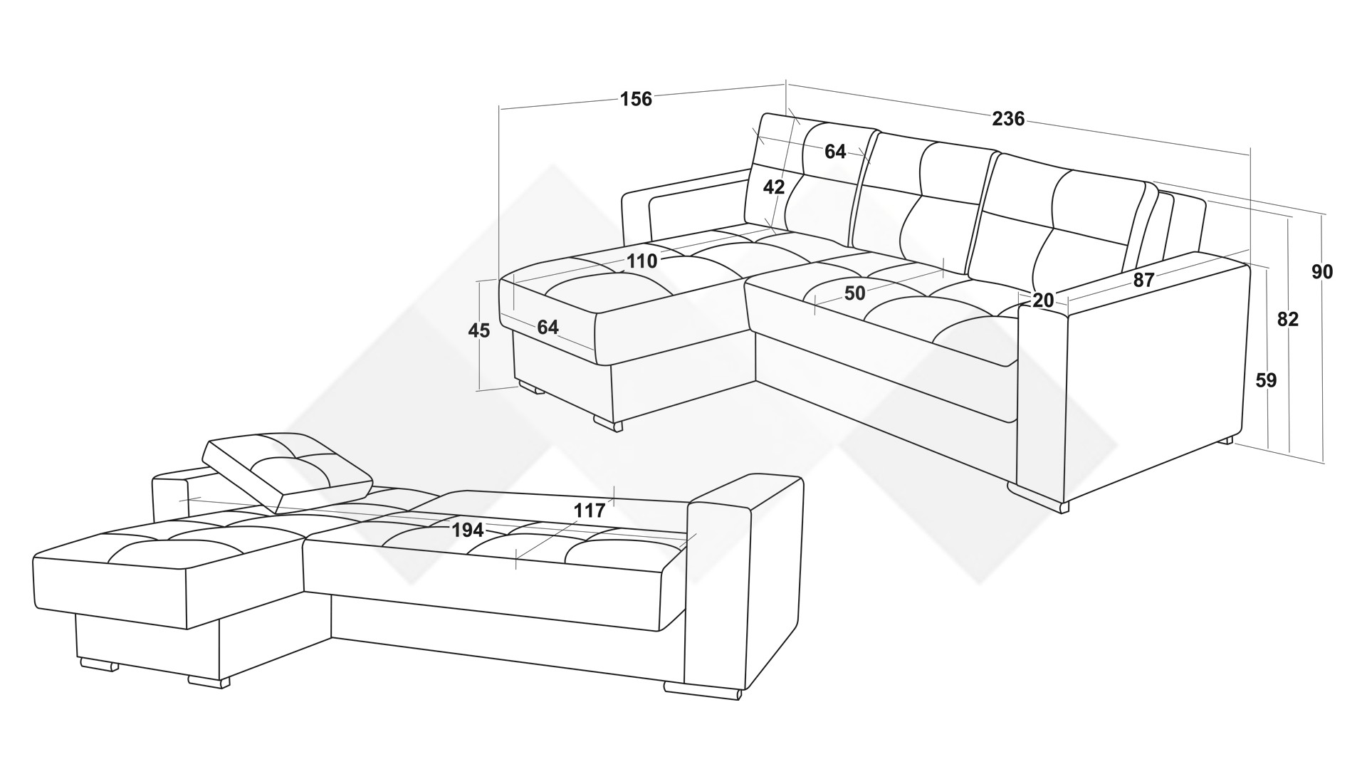 Д: 236 см Ш: 156 см В: 90 см