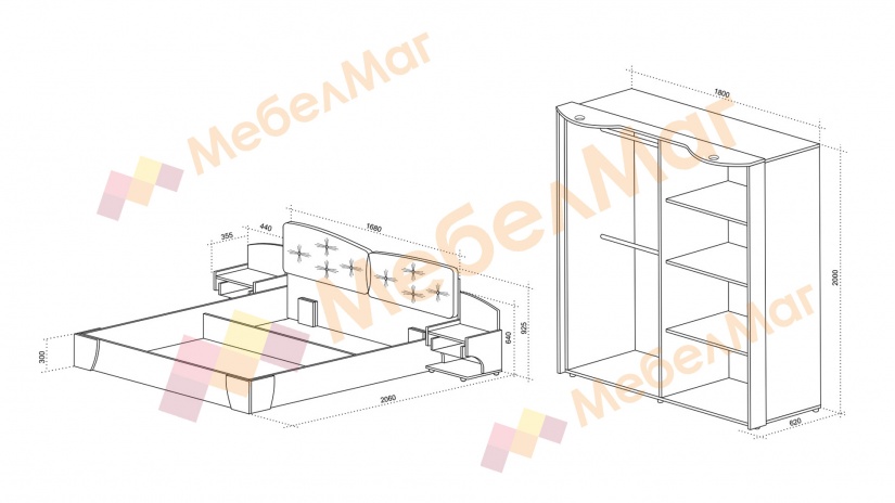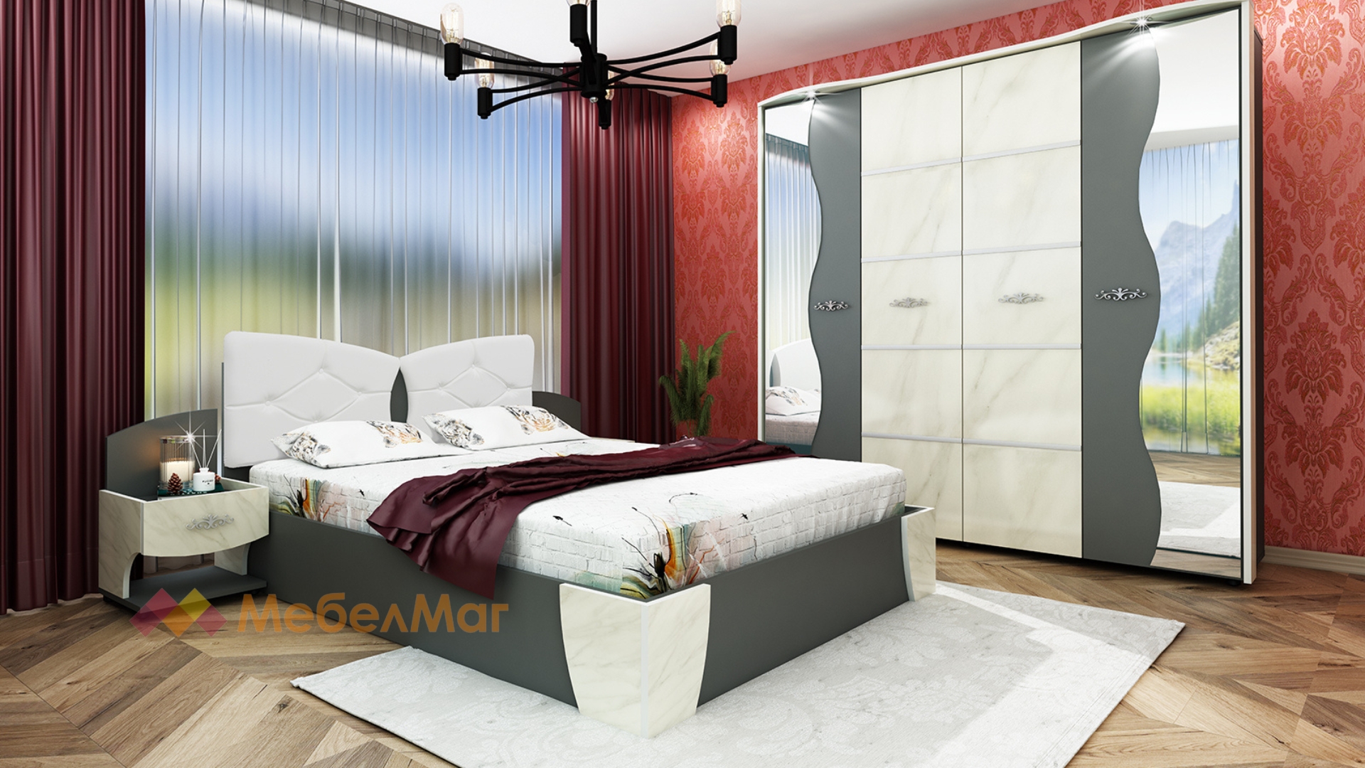 Спалнята от този комплект е истинско бижу. Гърбът е тапициран в бяла еко кожа, а мекотата при облягане е осезаема. Включените нощни шкафчета придават допълнителна уникалност на комплекта заради необикновената си форма. Дръжките на чекмеджетата им са с формата на основната апликация. В долната част на нощните шкафчета са монтирани рафтчета, подходящи за зареждане на мобилен телефон през нощта или поставяне на малка лампа.