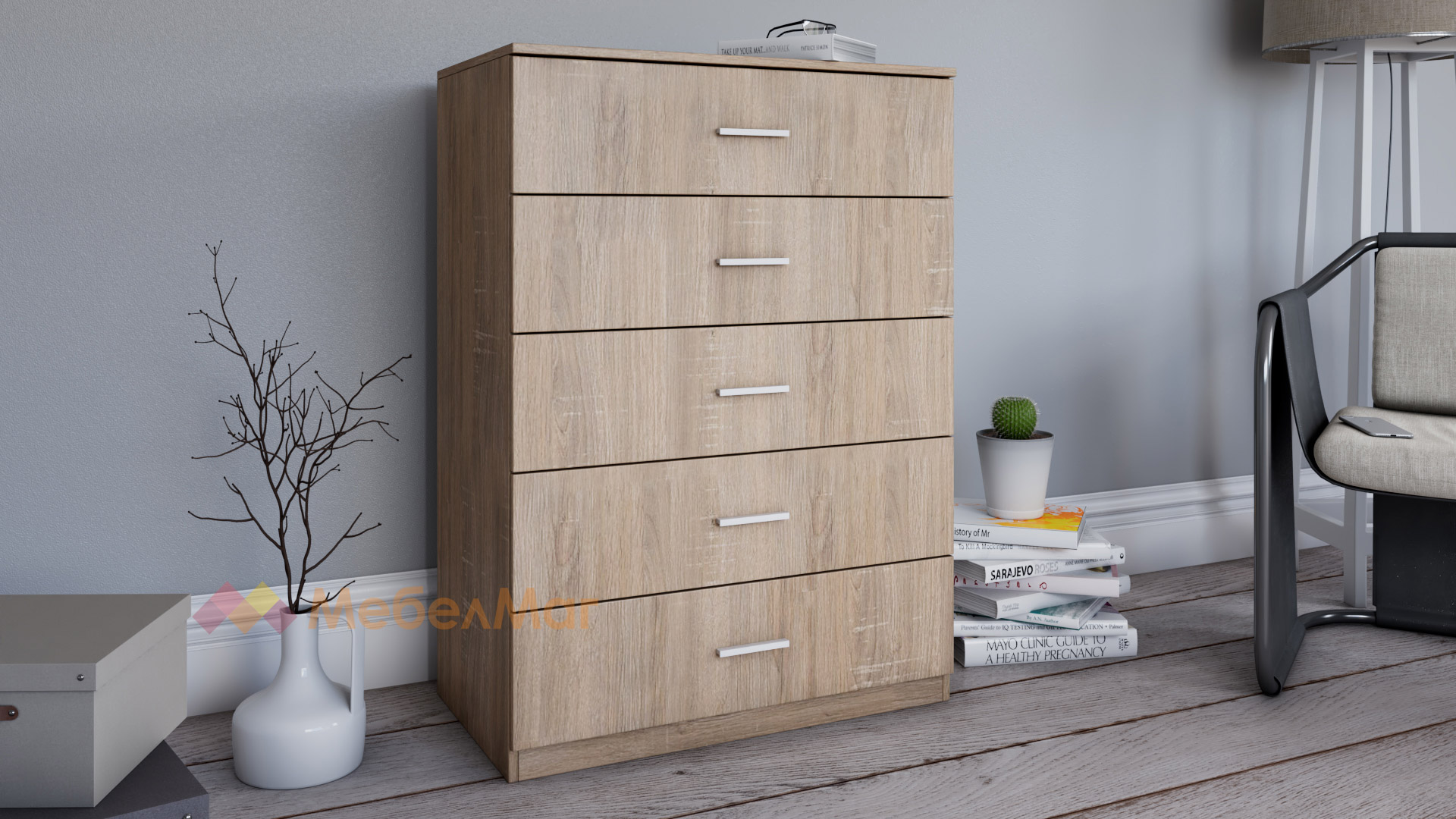Благодарение на умело проектираният дизайн, разполагаш с пет просторни чекмеджета, в които с лекота ще организираш голямо количество дрехи, бельо, аксесоари или други необходими за теб вещи. Плотът над тях е идеално място за подреждане на любимите ти сувенири, фотографии и книги, които да придадат стил на дома ти. Моделът е универсален и ще намери приложение във всяка стая. Независимо дали имаш нужда от допълнителен шкаф за спалнята, скрин за дневната или коридора – моделът ще оправдае очакванията ти и ще ти служи дълго.