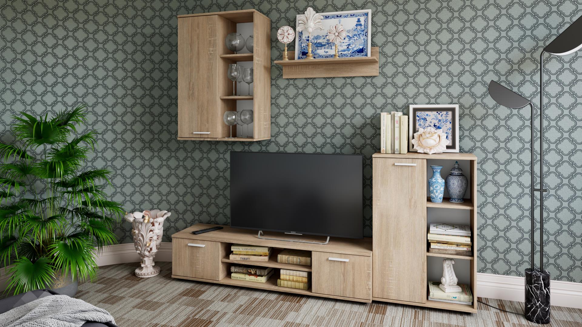 ⭐ Предимства: ✓ модерен декор ✓ ТВ шкаф с широк плот ✓ висок шкаф ✓ окачен шкаф ✓ етажерка ✓ асиметричен дизайн ✓ 16 мм ПДЧ