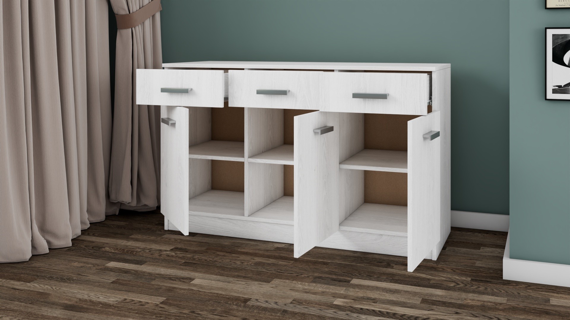 Скринът разполага с три просторни чекмеджета, които предлагат обширно място за съхранение на бельо, аксесоари или други лични вещи. Чекмеджетата се движат плавно и безшумно, осигурявайки лесен достъп до съдържанието им. Трите шкафа с вратички предоставят допълнително пространство за съхранение на дрехи, книги или други предмети, които искаш да бъдат организирани и лесно достъпни. Вътрешните рафтове в шкафовете осигуряват оптимално използване на пространството.