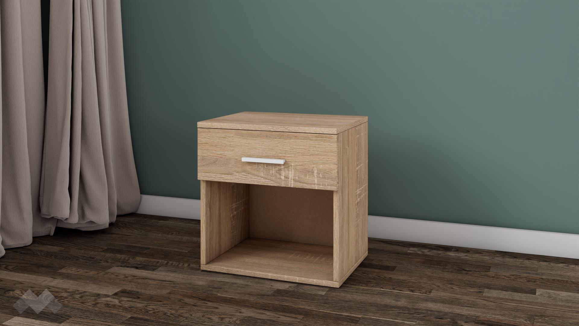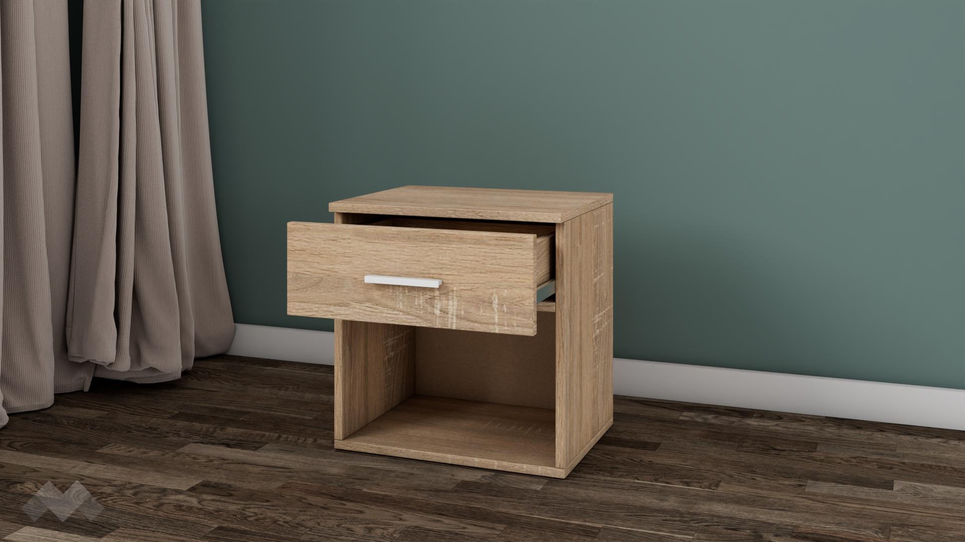 Нощно шкафче Арго е малко, но практично. Благодарение на оптималната му височина, то ще пасне на всяко легло. Чекмеджето и отвореният рафт ти предоставят достатъчно място за съхранение на всички най-необходими вещи, за да са винаги на една ръка разстояние. Върху горния плот можеш да поставиш нощна лампа или книгата, която четеш преди сън.