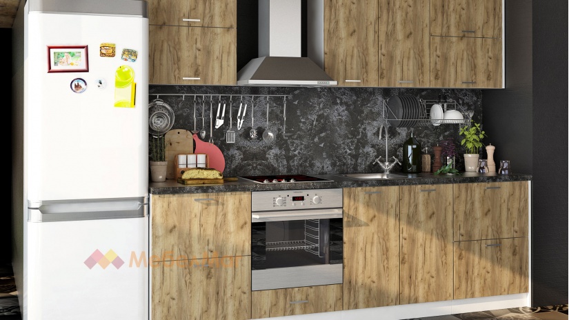 Линейните кухни са изключително удобни и за по-малки кухни. Хладилникът, печката и мивката ще са на една линия, което я прави много удобна за работа и приготвяне на ястия. Разполагаш с шкаф за фурна, термоплот с дебелина 28 мм, множество шкафове с вратички и по един рафт.