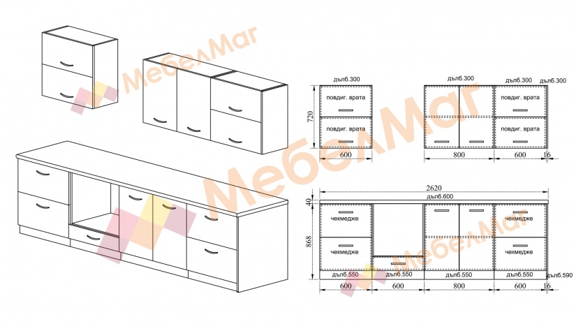 Долен ред: Д: 262 см Ш: 60 см В: 89.6 см