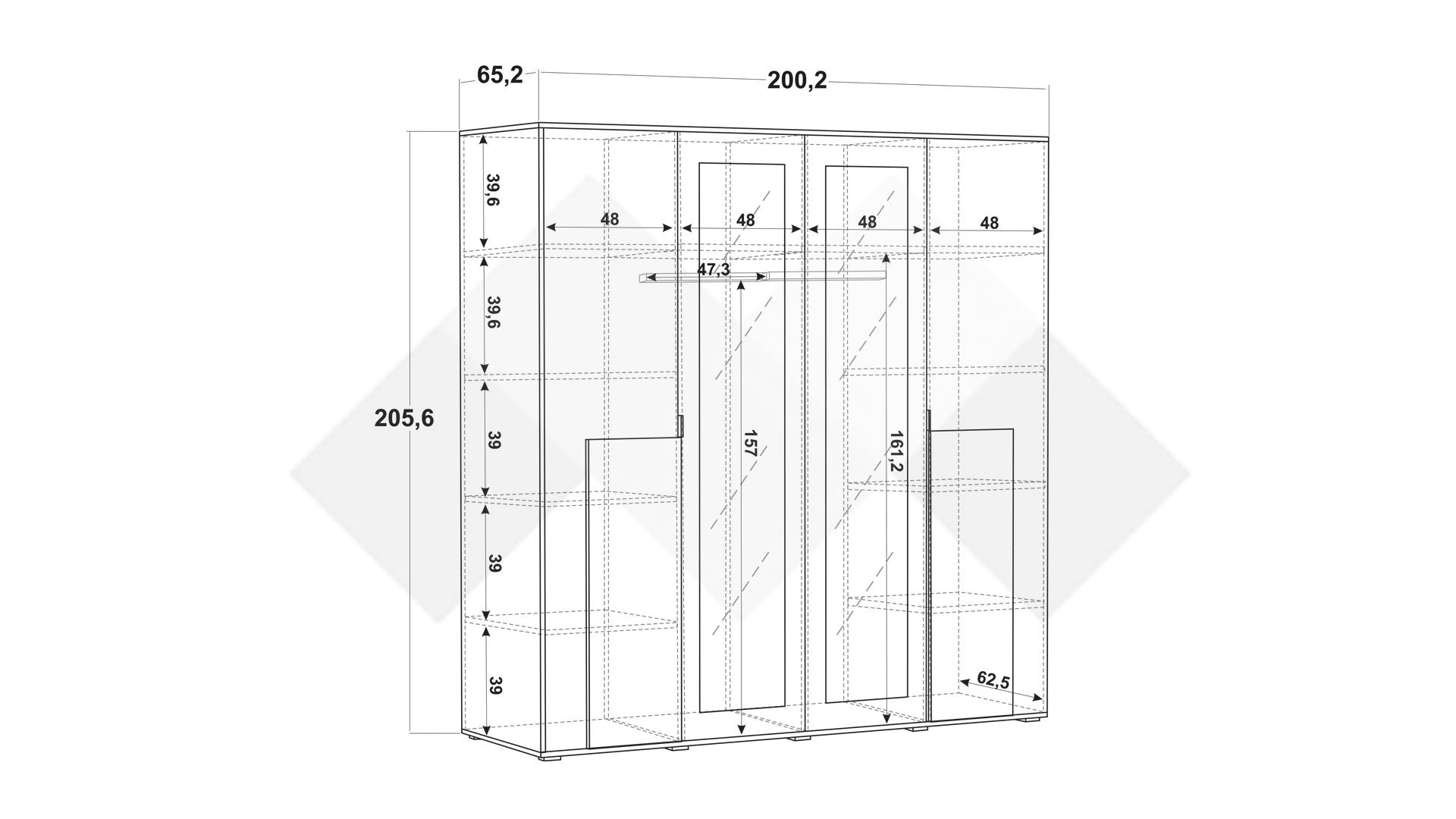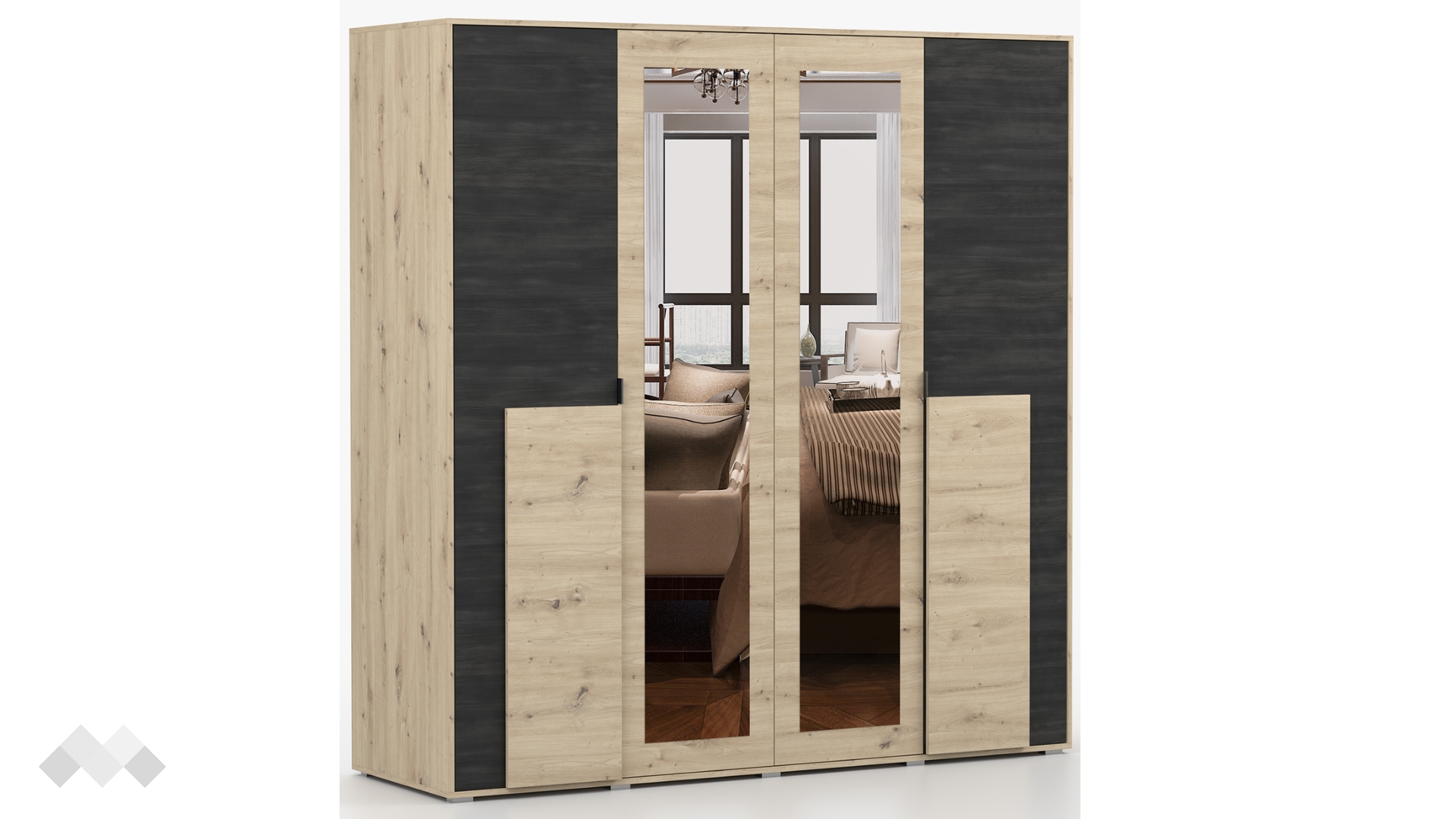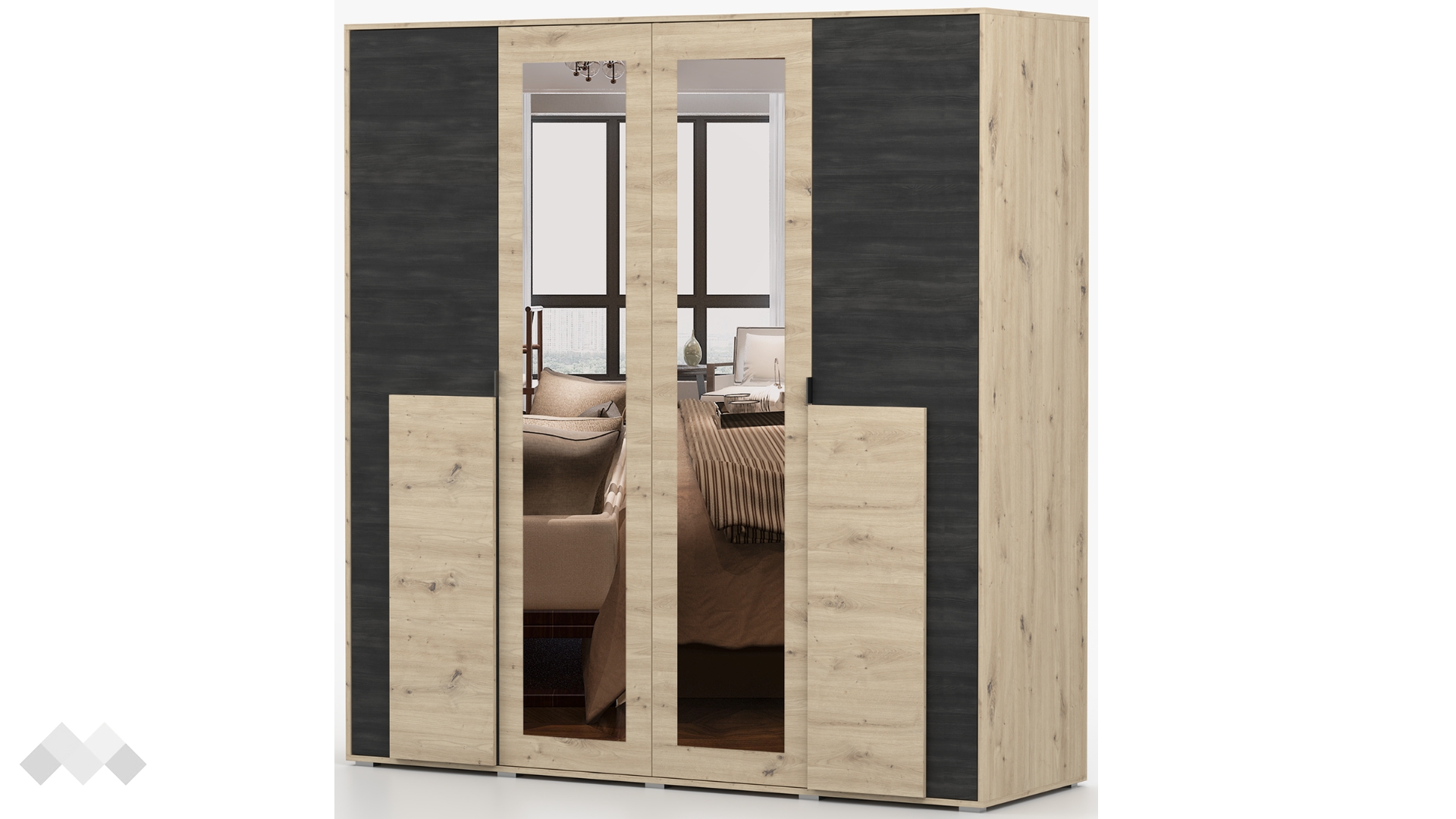 ⭐ Предимства: ✓ четирикрилен гардероб ✓ практично разпределение ✓ 2 огледала ✓10 рафта ✓ 2 бр. лост за закачалки ✓ модерен декор ✓ качествена изработка ✓ 16 мм ПДЧ