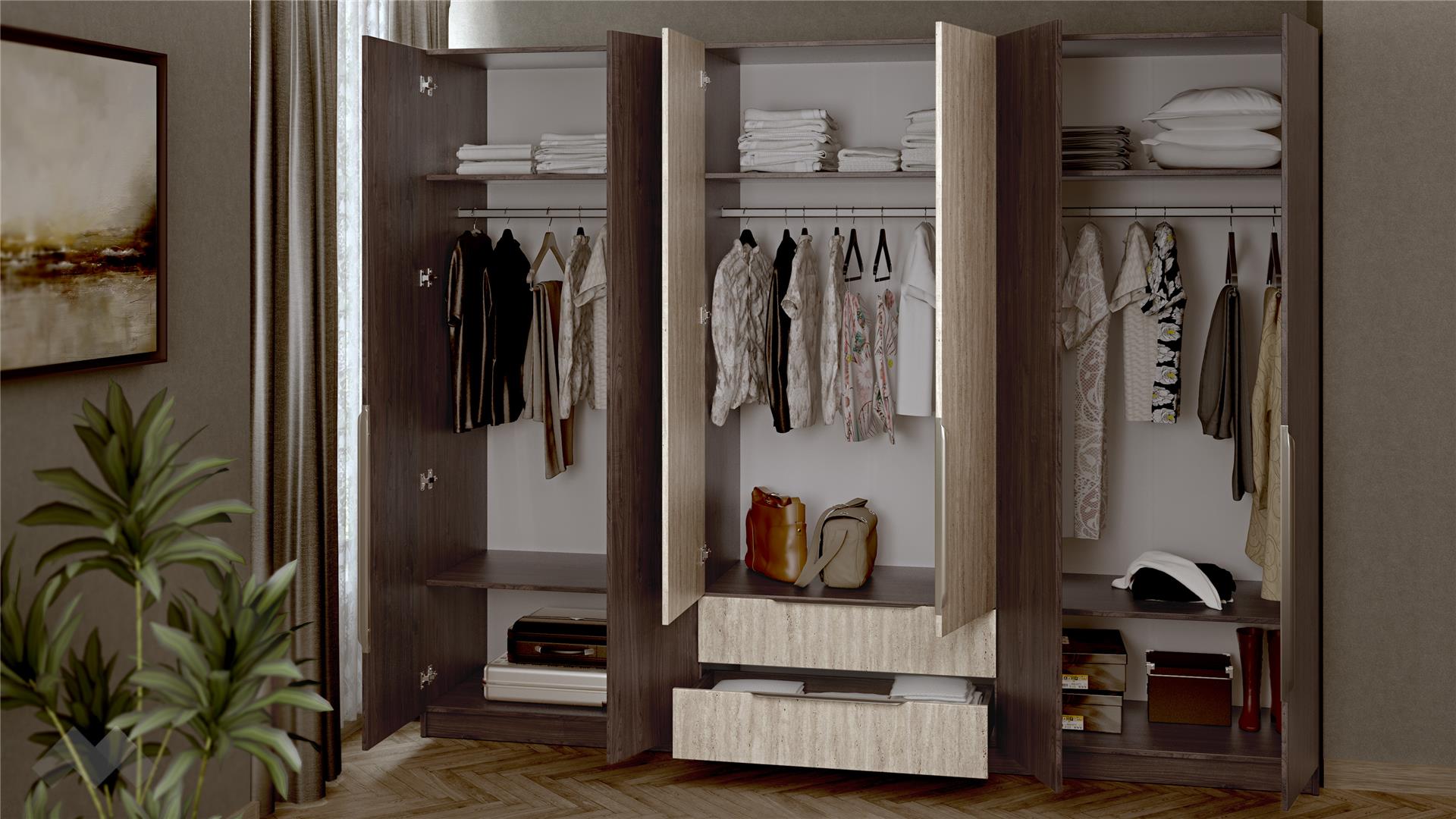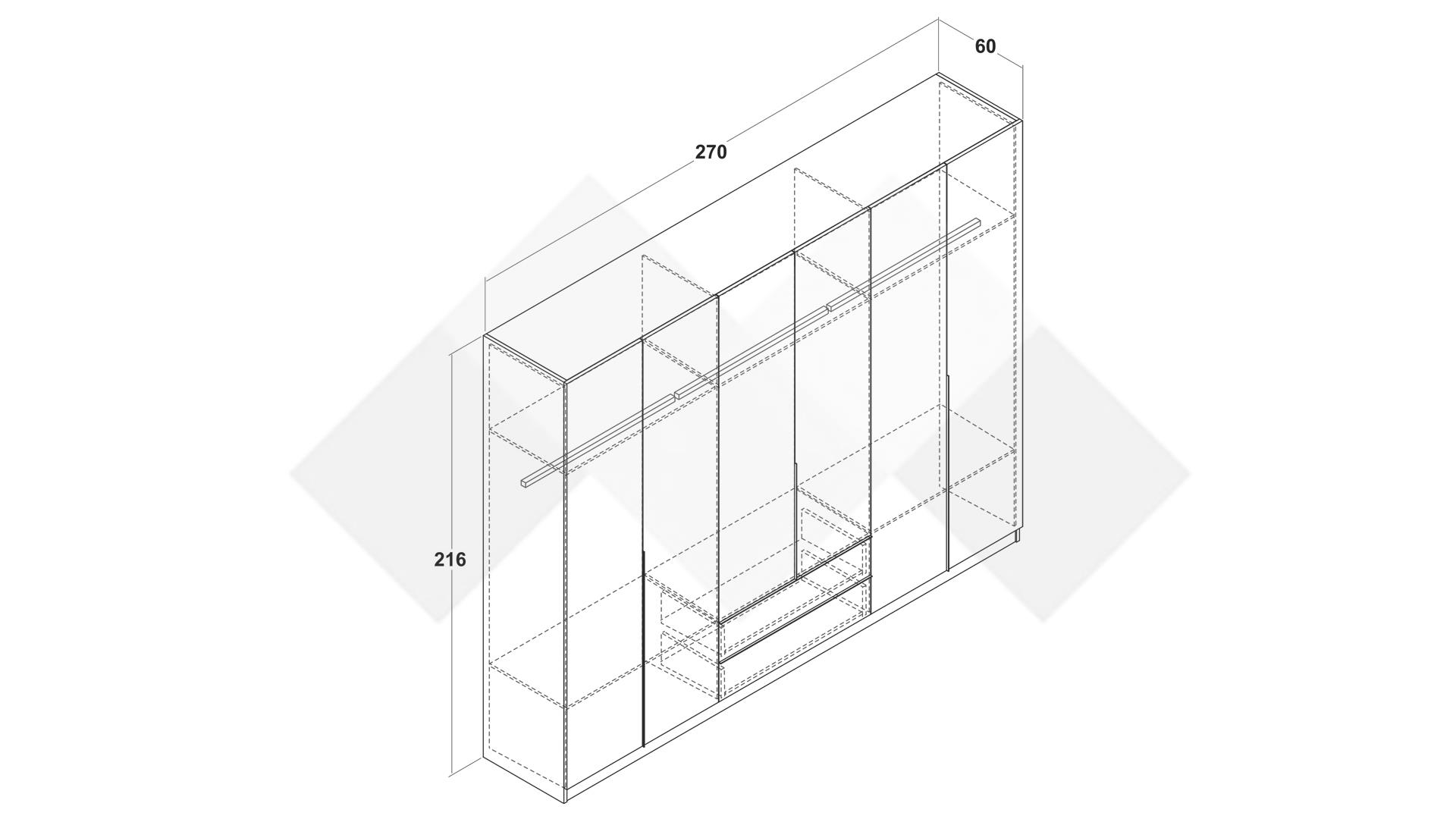 Зад крайните двойки врати, гардеробът ти предоставя по два рафта, на които да подредиш своите дрехи, кутии с обувки или спално бельо, а дълбочината му и по един лост за закачалки за връхни дрехи, или тези, които не искаш да бъдат измачкани. Зад средната двойка врати също има рафт и лост за закачалки, но в допълнение на функционалността ще откриеш две чекмедежта, в които както бельо или дрехи, може да прибереш малки електроуреди. Вратите на гардероба са снабдени с механизъм за плавно затваряне, за по-дълго и безпроблемно експлоатиране.