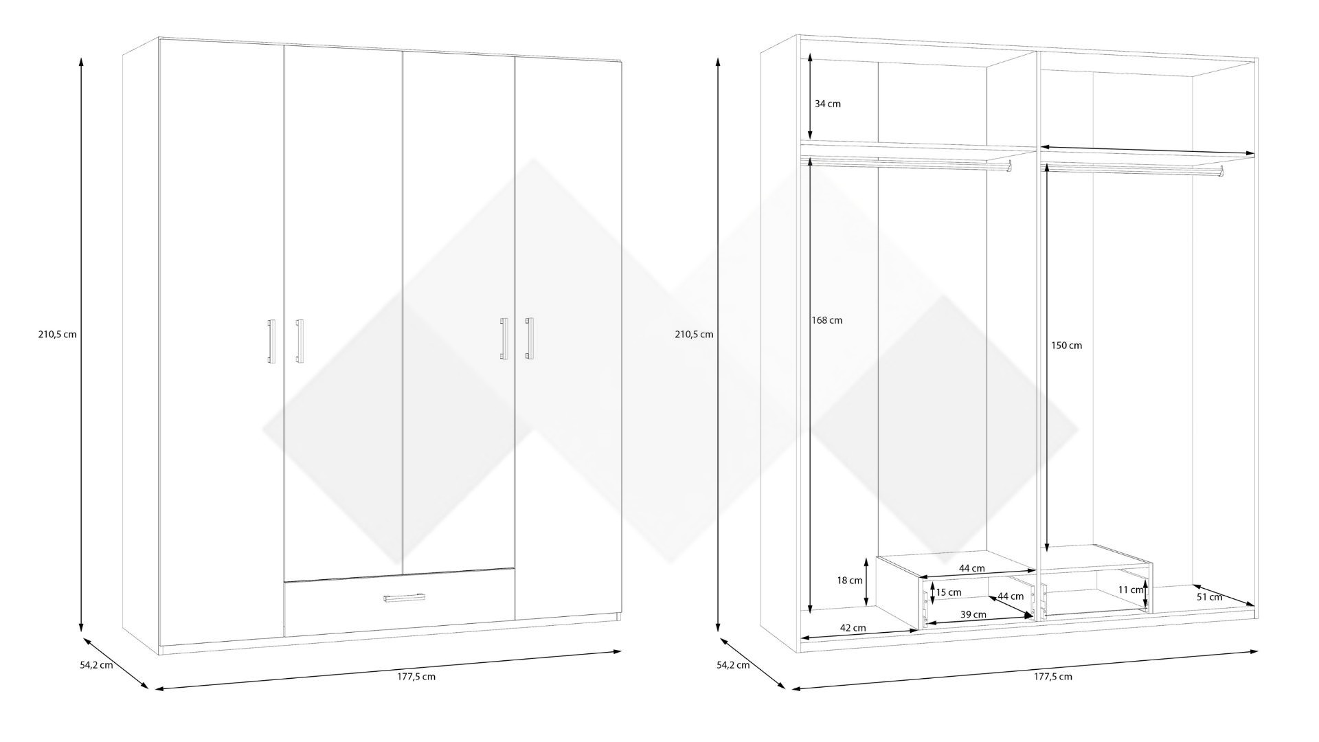 На твое разположение са два лоста за закачалки, където можеш да съхраняваш ризи, сака или палта. Гардеробът е с два рафта, на които можеш да организираш сгънати дрехи, хавлии, завивки или аксесоари. За още по-голямо удобство сме добавили и просторно чекмедже, подходящо за съхранение на бельо, чорапи или дребни принадлежности.
