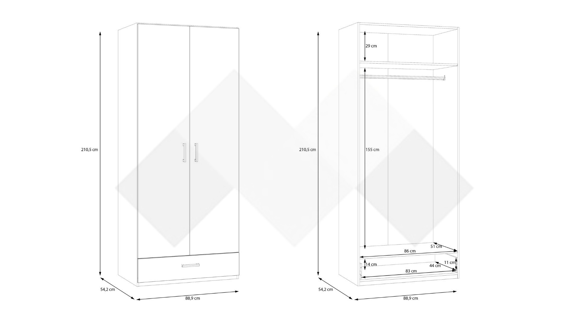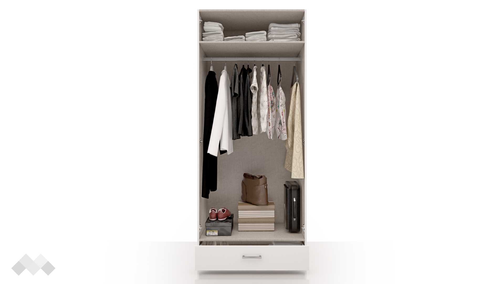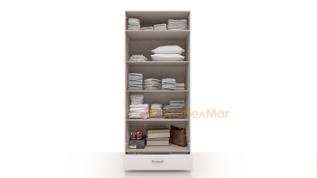 Зад крилата ще намериш широко пространство и лост за закачалки, където да съхраниш ризи, сака или по-обемни дрехи като палта. В долната част гардеробът изненадва с нестандартно решение от чекмедже, където можеш да организираш бельо, чорапи, малки електроуреди или друг вид вещи, нуждаещи се от място.
