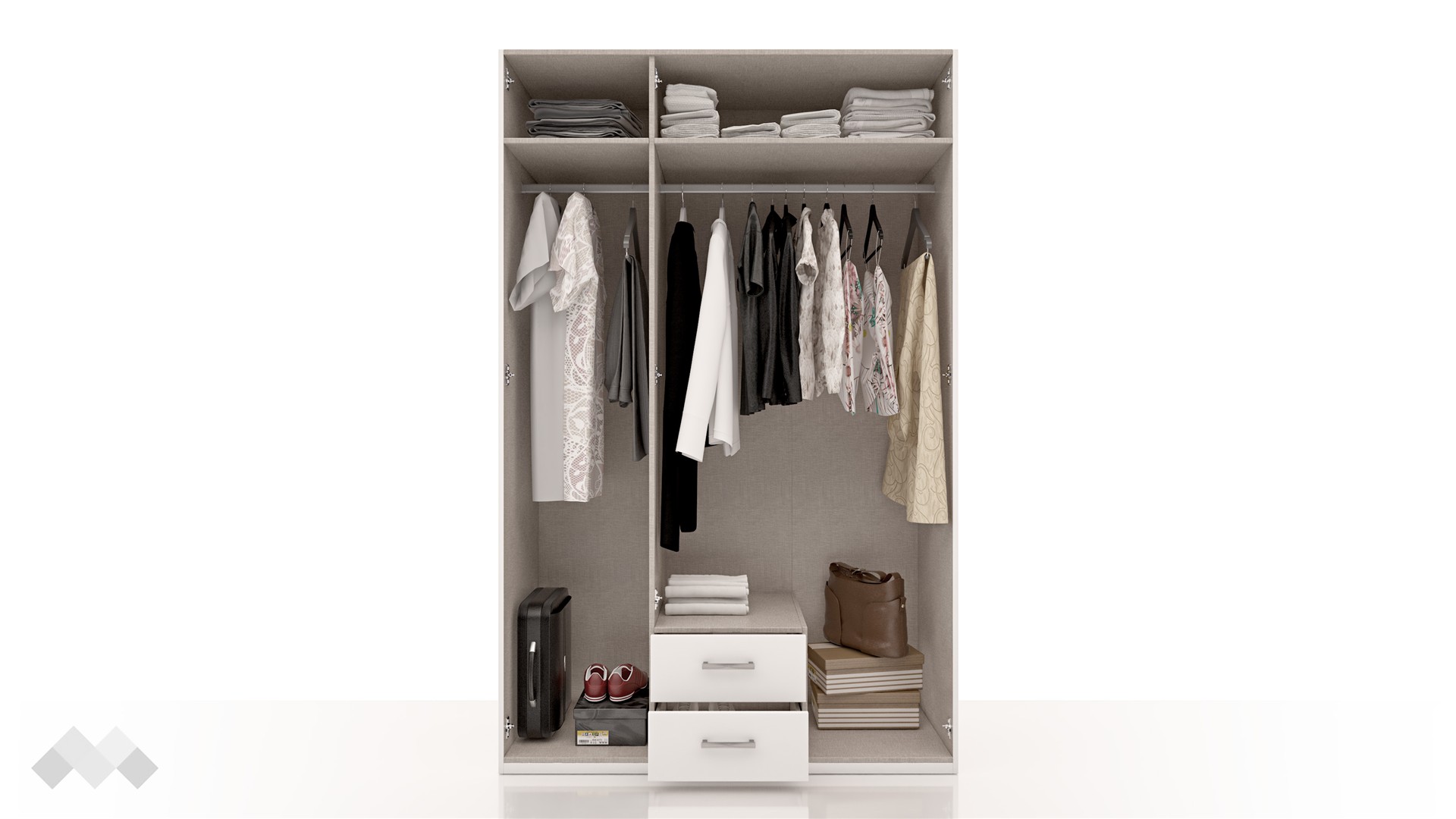 Той ще те впечатли с функционално разпределение, което ще ти позволи да подредиш добре всички дрехи и аксесоари. Благодарение на изчистения и модерен дизайн, този гардероб би се вписал във всеки интериор. Той радва със своята практичност - а твое разположение са два лоста за закачалки, два рафта за съхранение на дрехи или вещи и две чекмеджета в средата на гардероба. Така всичко ще бъде перфектно организирано.