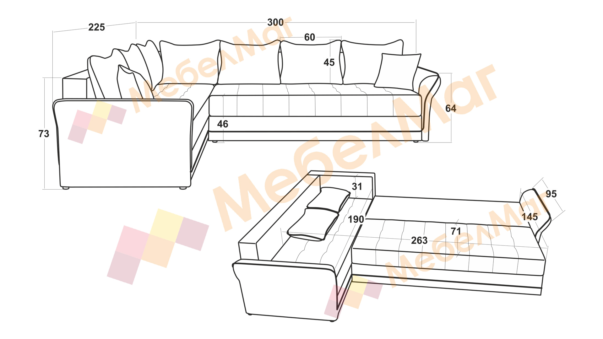 Д: 300 см Ш: 225 см В: 73 см