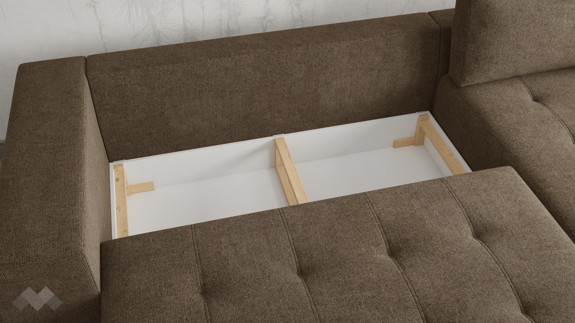 Диванът разполага с три броя големи и два броя по-малки декоративни възглавници, върху които да се отпуснеш след дълъг и уморителен ден. Освен това, има ракла, в която можеш да прибереш възглавници или завивки. Чрез функцията падащ гръб за секунди се превръща в удобно легло с площ за сън 148/280 см.