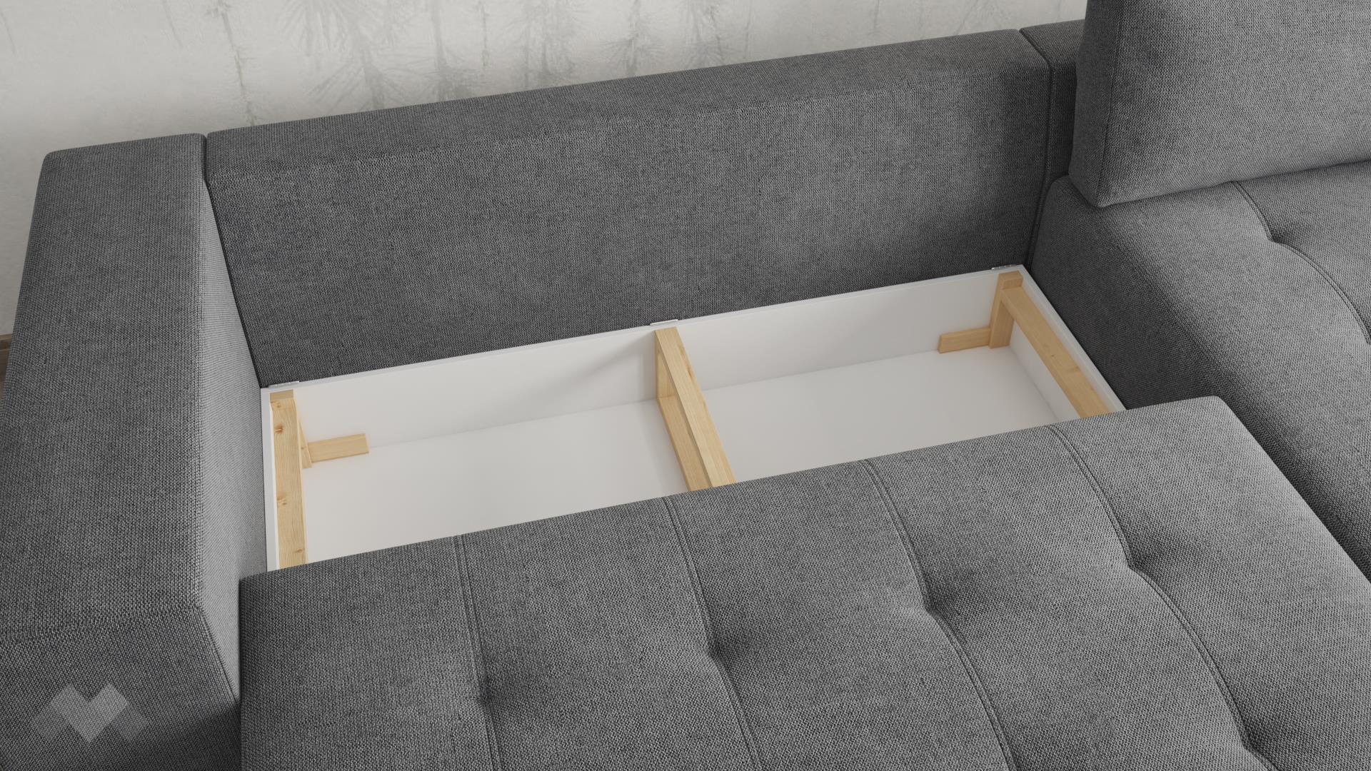 Диванът разполага с три броя големи и два броя по-малки декоративни възглавници, върху които да се отпуснеш след дълъг и уморителен ден. Освен това, има ракла, в която можеш да прибереш възглавници или завивки. Чрез функцията падащ гръб за секунди се превръща в удобно легло с площ за сън 148/280 см.