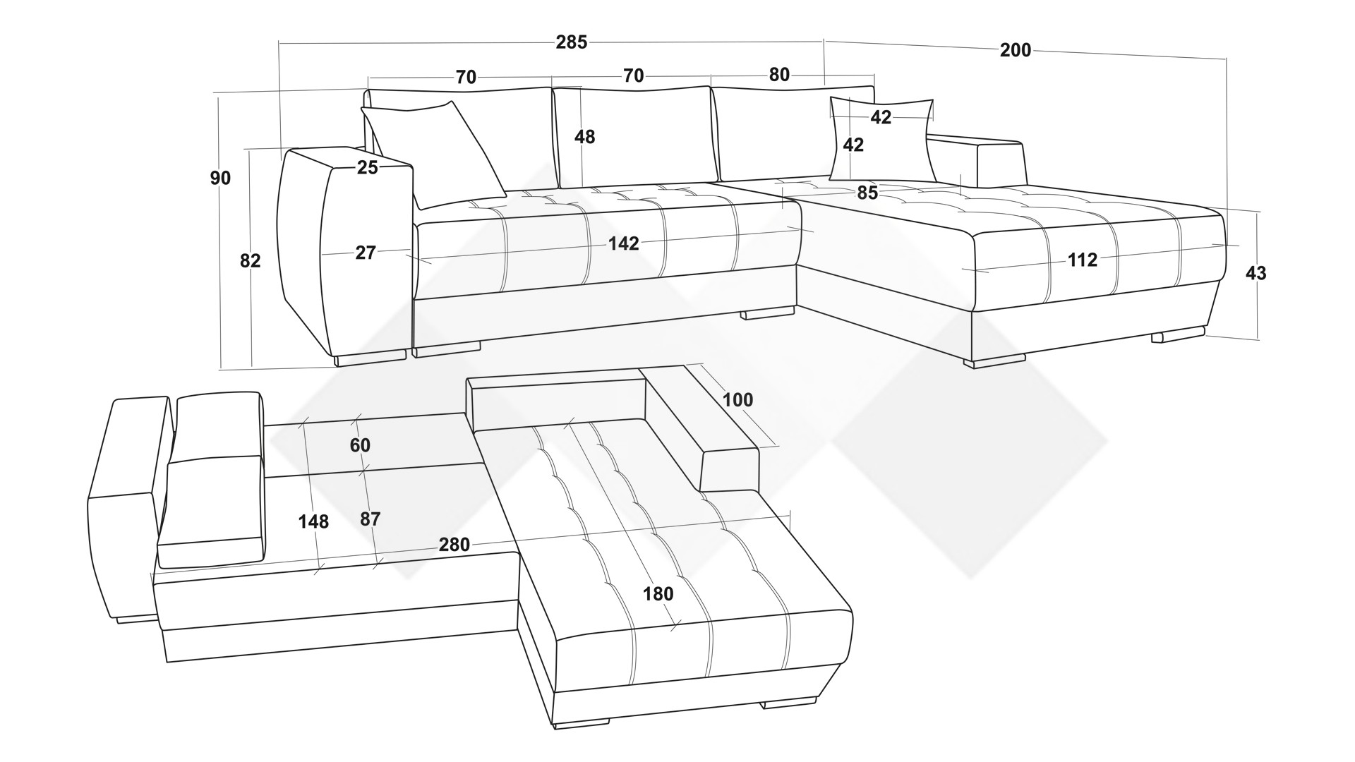 Д: 285 см Ш: 200 см В: 90 см