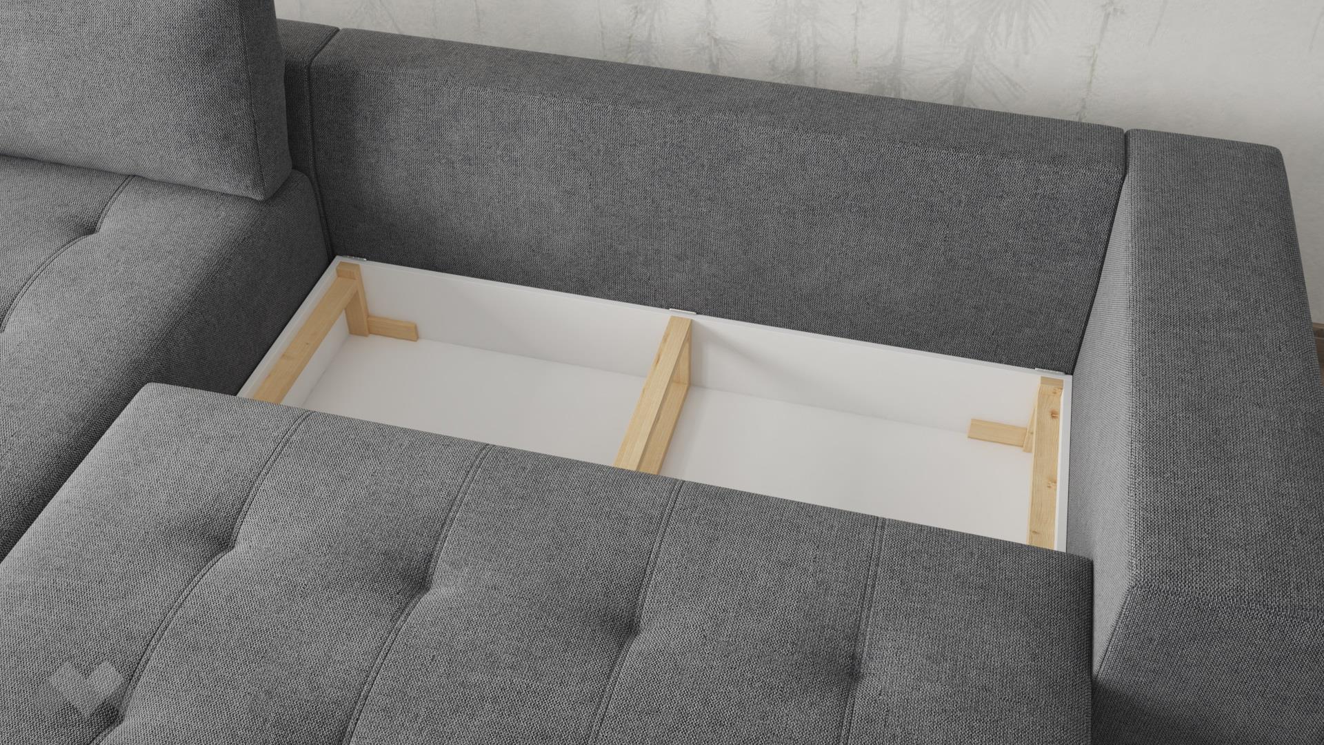 Диванът разполага с три броя големи и два броя по-малки декоративни възглавници, върху които да се отпуснеш след дълъг и уморителен ден. Освен това, има ракла, в която можеш да прибереш възглавници или завивки. Чрез функцията падащ гръб за секунди се превръща в удобно легло с площ за сън 148/280 см.