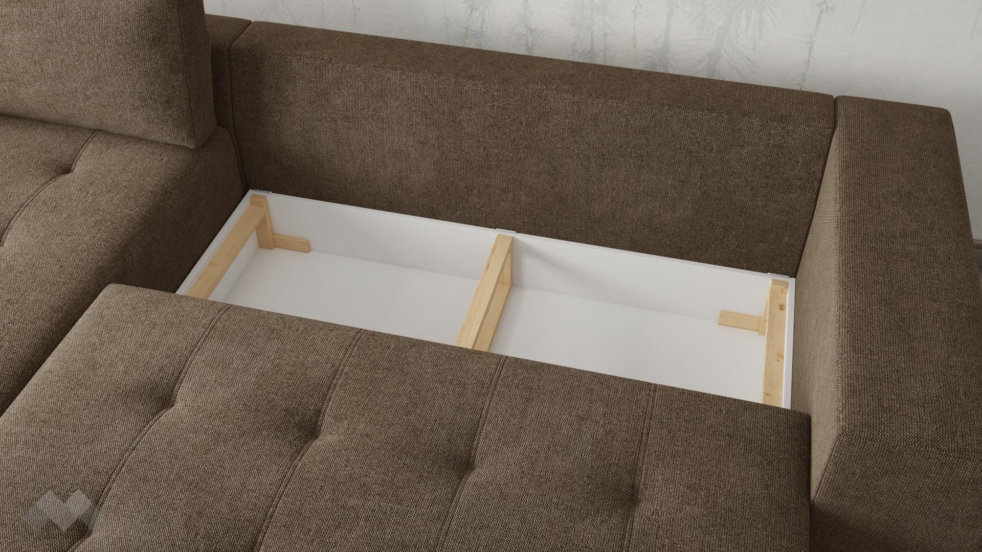 Диванът разполага с три броя големи и два броя по-малки декоративни възглавници, върху които да се отпуснеш след дълъг и уморителен ден. Освен това, има ракла, в която можеш да прибереш възглавници или завивки. Чрез функцията падащ гръб за секунди се превръща в удобно легло с площ за сън 148/280 см.