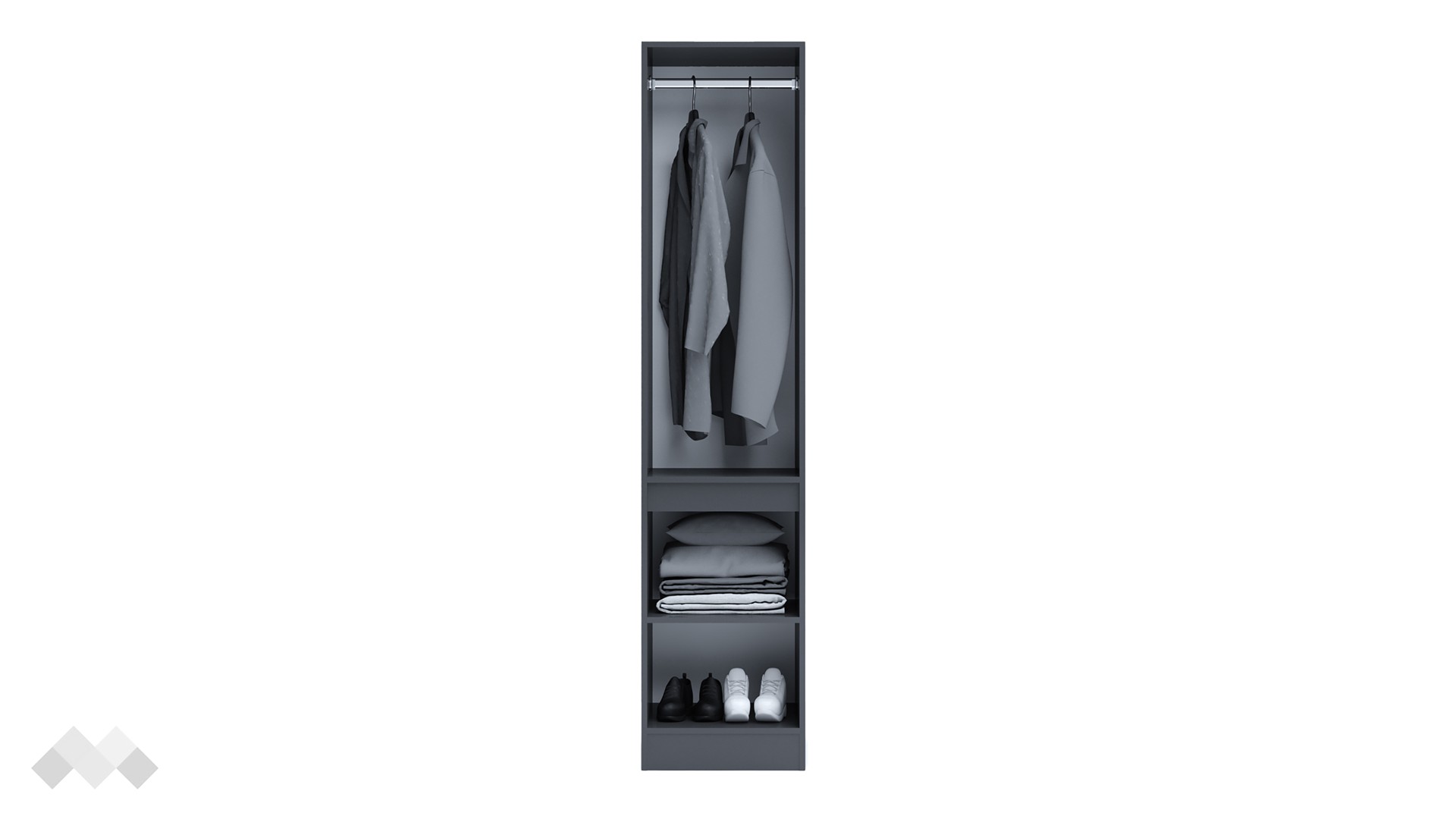 Еднокрилен гардероб Борей е не само стилно, но и практично допълнение към всяка спалня или коридор. Моделът разполага с лост за закачалки в горната част, предоставящ място за съхранение на елегантни облекла, запазвайки ги в безупречен вид. Рафтът предлага допълнително пространство за сгънати дрехи, кутии за обувки или други предмети, които искаш да бъдат организирани и лесно достъпни. Вратите на гардероба са оборудвани с механизъм за плавно затваряне, който осигурява тихо и нежно затваряне, предпазвайки мебелите и удължавайки техния живот.