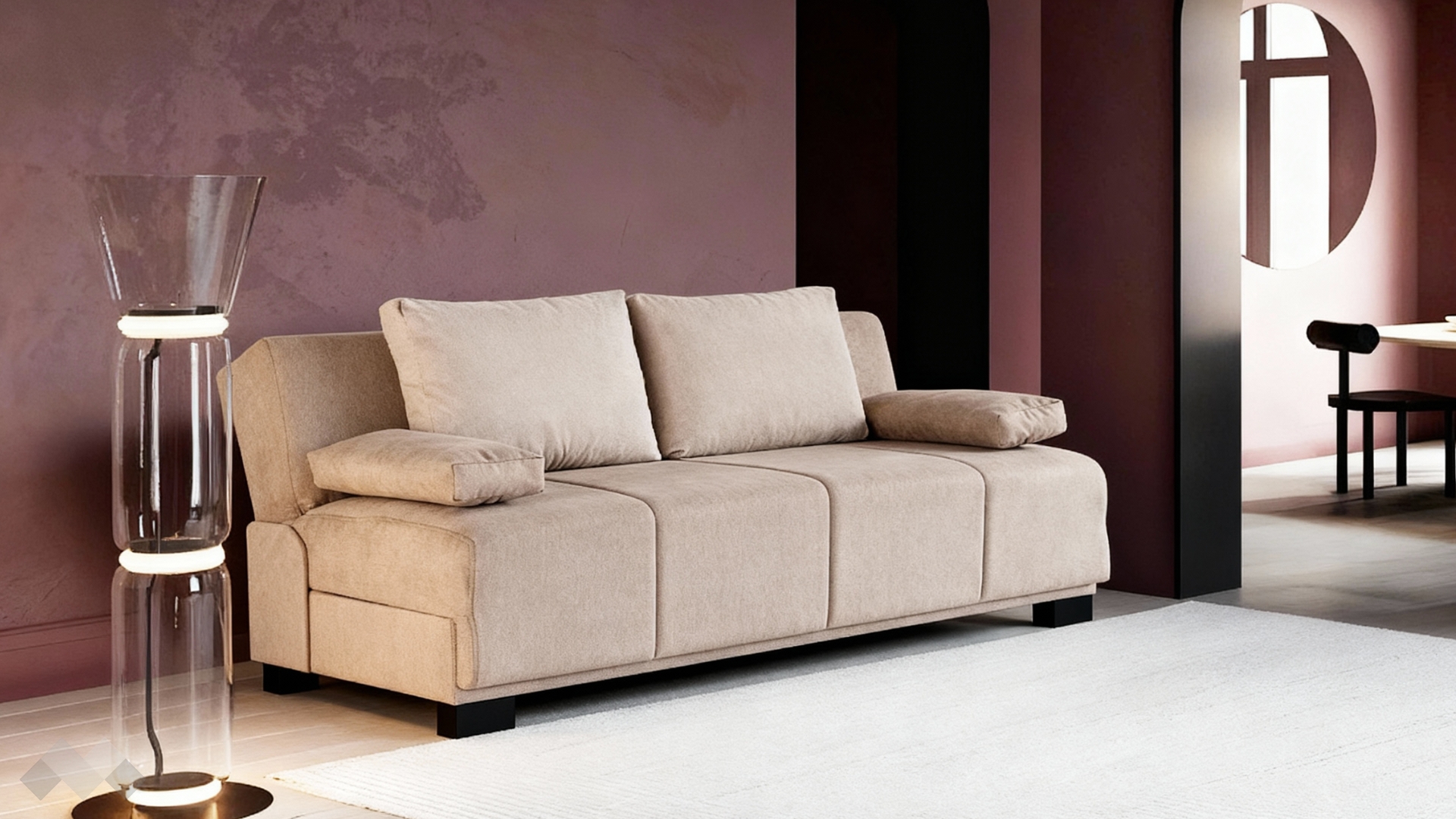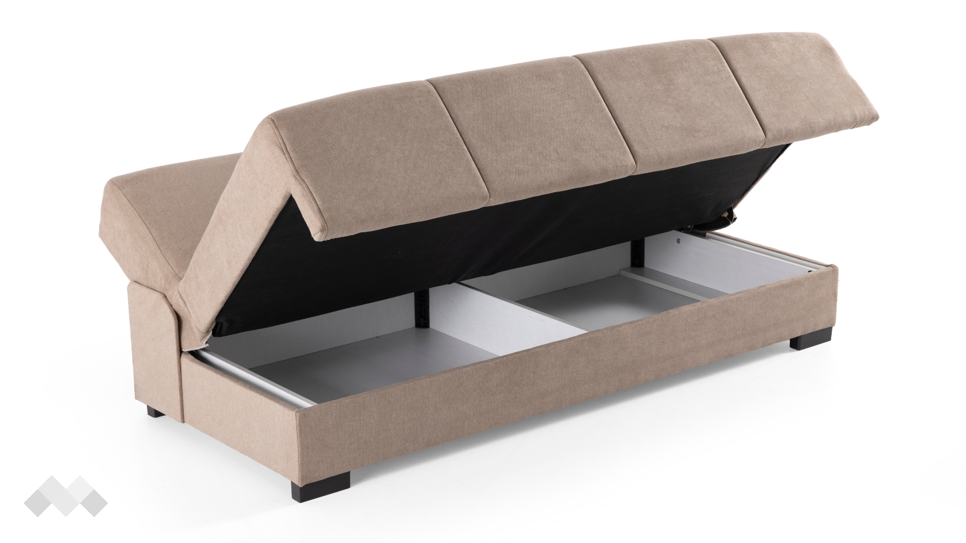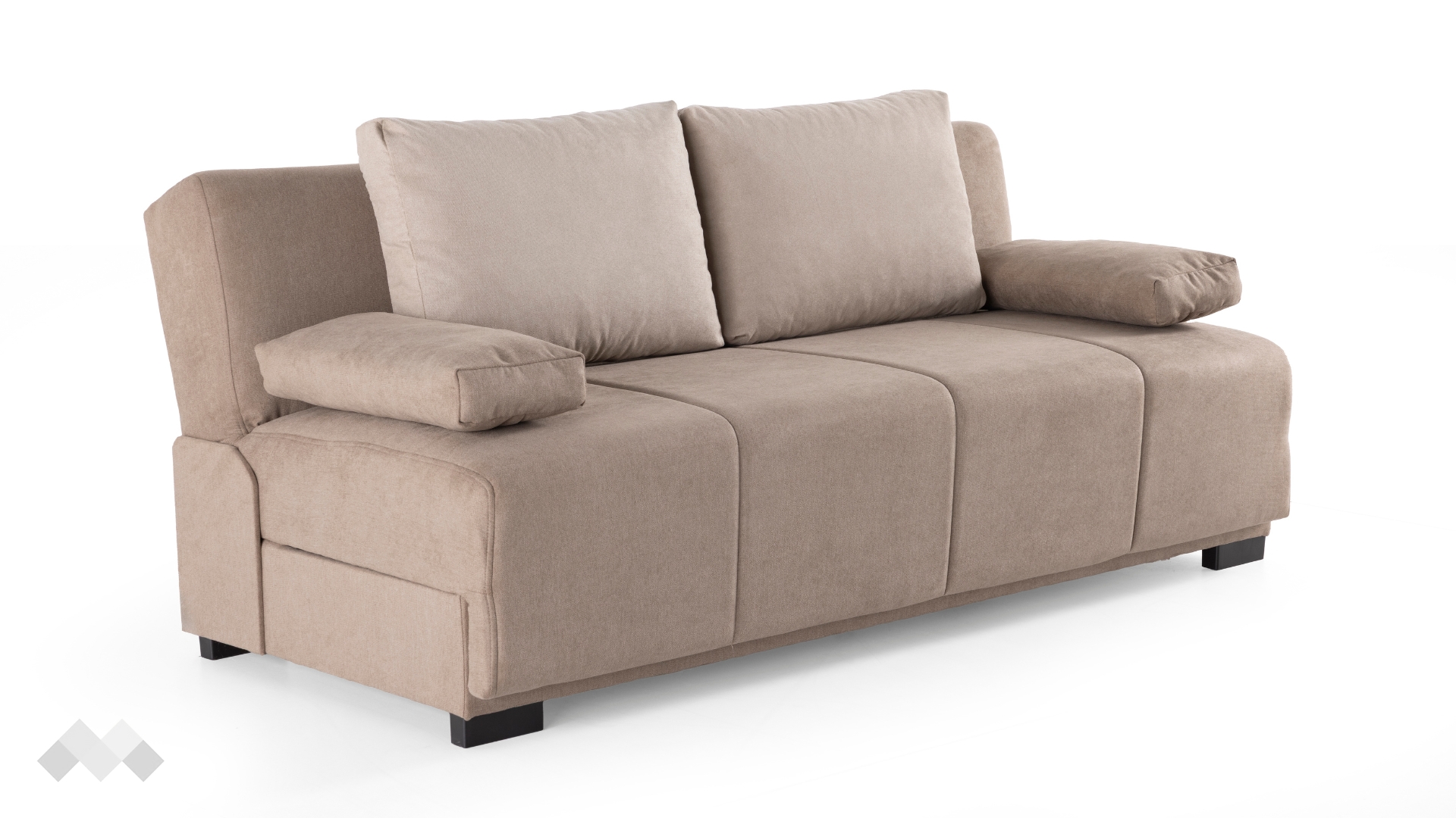 Канапето разполага с удобни възглавници за подлакътници, които осигуряват допълнителна опора при седене и могат лесно да се премахнат, за да се освободи повече пространство за отдих. Под меката седалка ще откриеш практична ракла – идеална за съхранение на одеяла, възглавници или други домашни принадлежности. А когато имаш нужда от легло, само с едно движение трансформираш канапето в удобна площ за сън, благодарение на лесния за използване клик-клак механизъм.