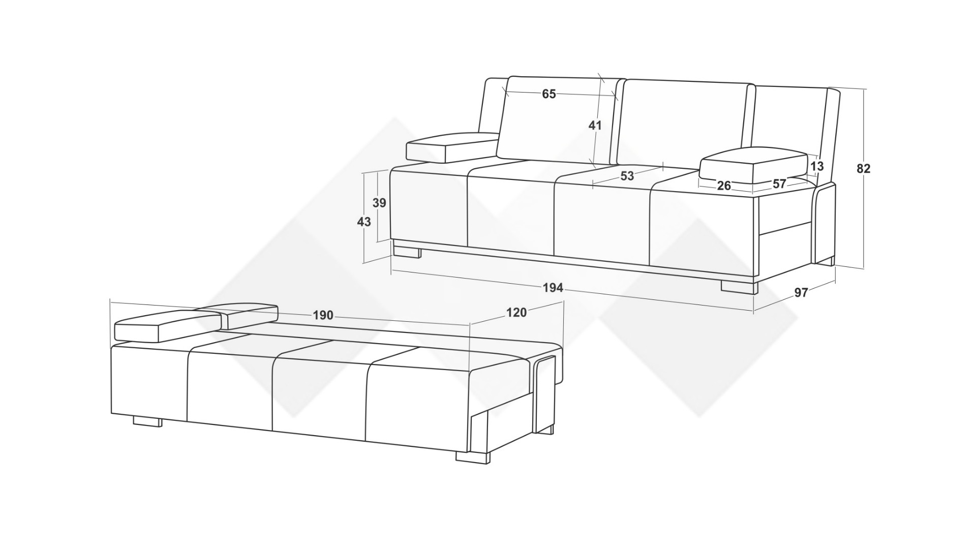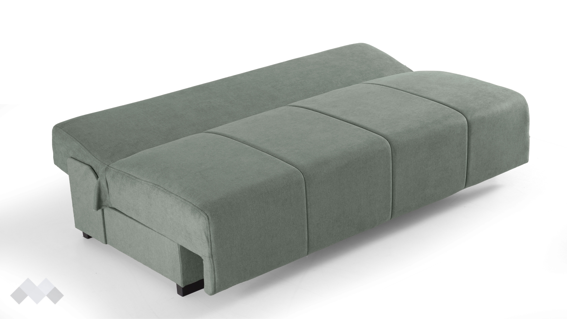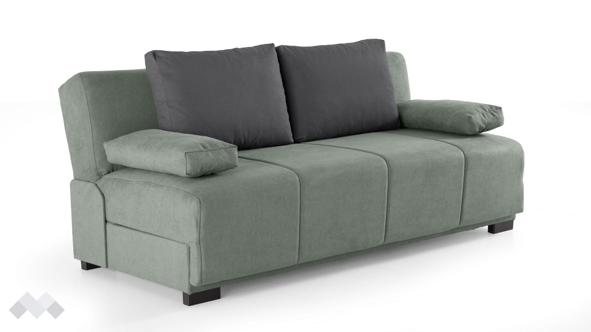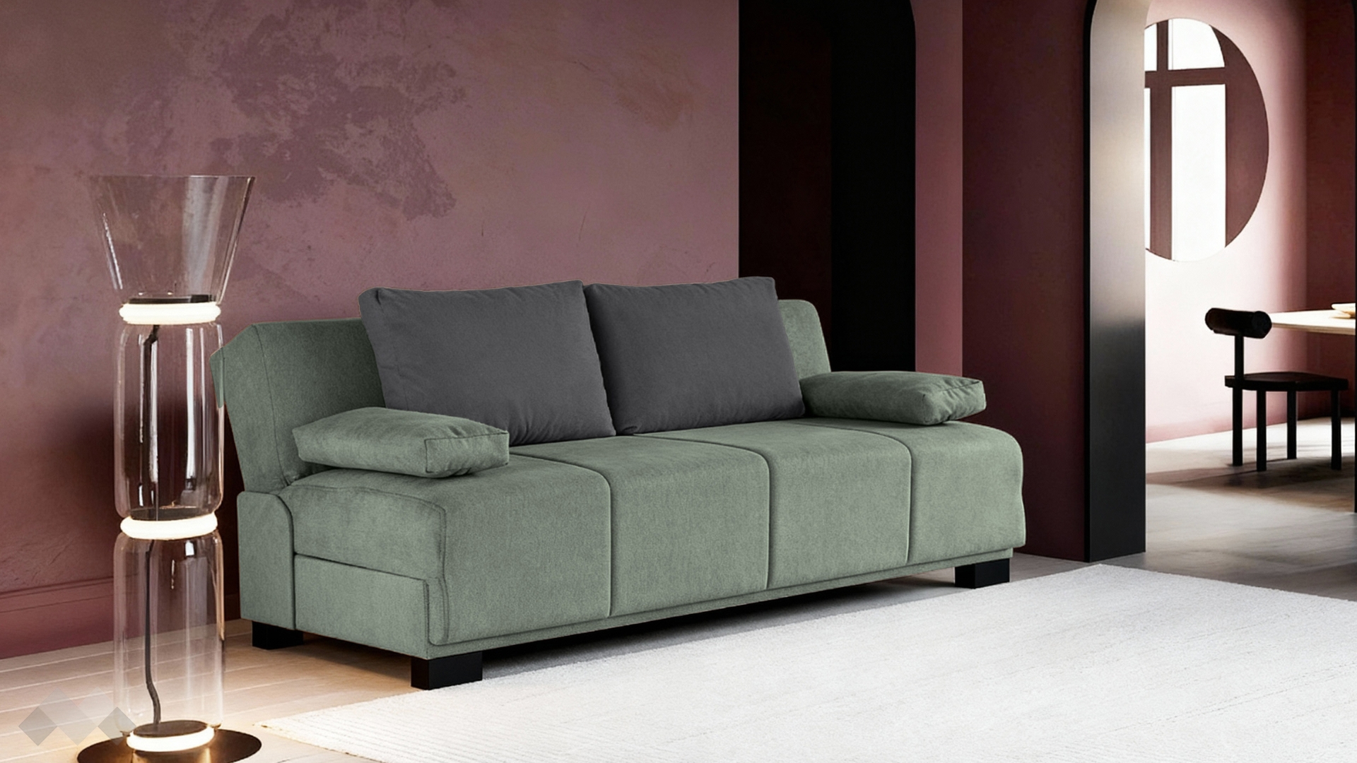 Канапето разполага с удобни възглавници за подлакътници, които осигуряват допълнителна опора при седене и могат лесно да се премахнат, за да се освободи повече пространство за отдих. Под меката седалка ще откриеш практична ракла – идеална за съхранение на одеяла, възглавници или други домашни принадлежности. А когато имаш нужда от легло, само с едно движение трансформираш канапето в удобна площ за сън, благодарение на лесния за използване клик-клак механизъм.