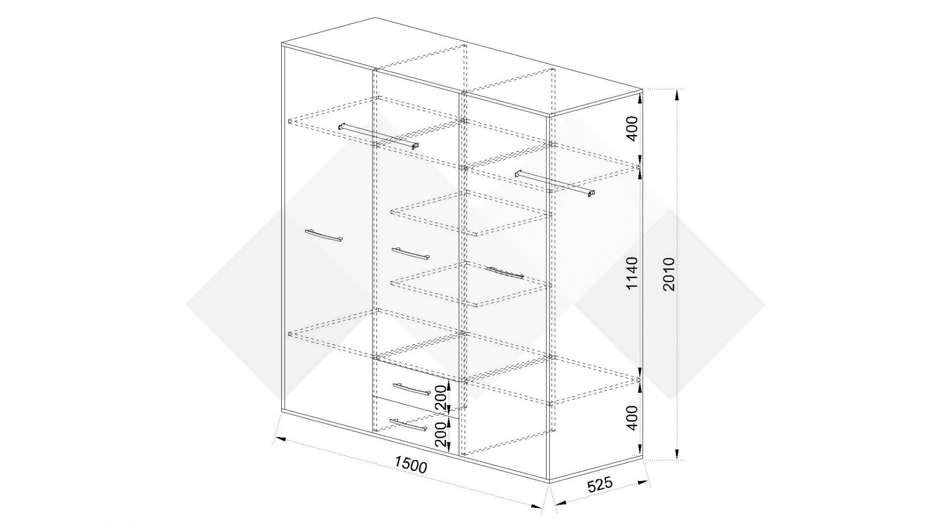 Вътрешното му разпределение е така проектирано, че да имаш бърз достъп до всичко и отговаря на съвременните стандарти за съхранение на дрехи. В две от крилата ще откриеш лост за закачалки, а в третото крило са разположени 4 удобни рафта, на които да разположиш сгънати дрехи, кутии или други принадлежности. Двете чекмеджета са удобни за съхранение на бельо, аксесоари или дрехи от деликатни материи.