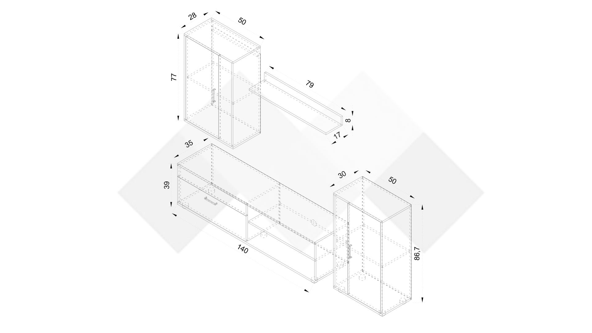 ТВ шкаф: Д: 140 см Ш: 35 см В: 39 см