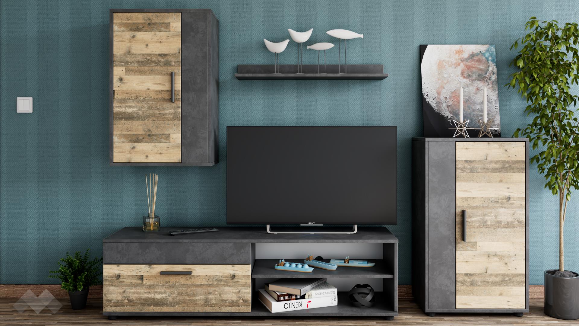 ⭐ Предимства: ✓ 2 отворени рафта ✓ ТВ шкаф ✓ висок шкаф ✓ окачен шкаф ✓ етажерка ✓ модерен дизайн ✓ функционална и практична ✓ качествена изработка ✓ 16 мм ПДЧ