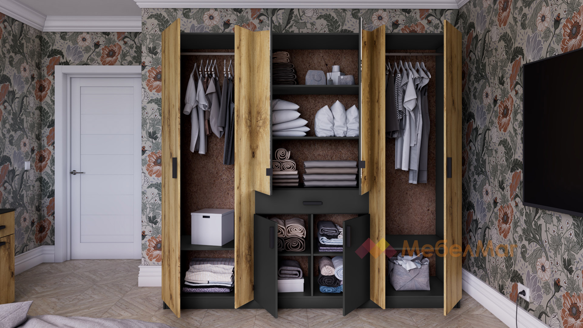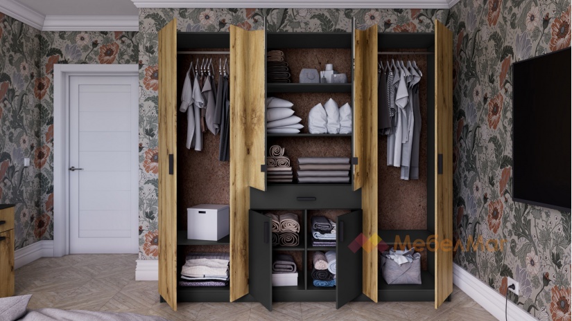 Гардеробът е практично разпределен, изцяло отговарящ на съвременните стандарти за съхранение на дрехи. Той разполага с множество рафтове, два лоста за закачалки и чекмедже, които ти позволяват с лекота да организираш добре всички вещи. Може да бъдеш сигурен, че този гардероб ще ти осигури достатъчно място за всички необходими завивки, дрехи, бельо и аксесоари. Ще ти допаднат и огледалата, разположени на вратите – те са незаменим помощник в ежедневието при избора на тоалет. Освен това, благодарение на тях стаята ще бъде по-осветена и ще изглежда визуално по-голяма.