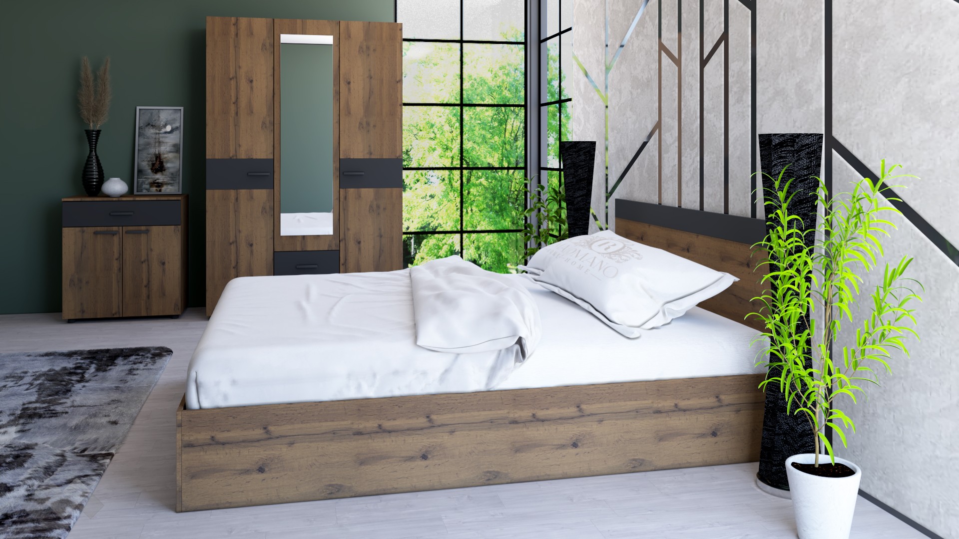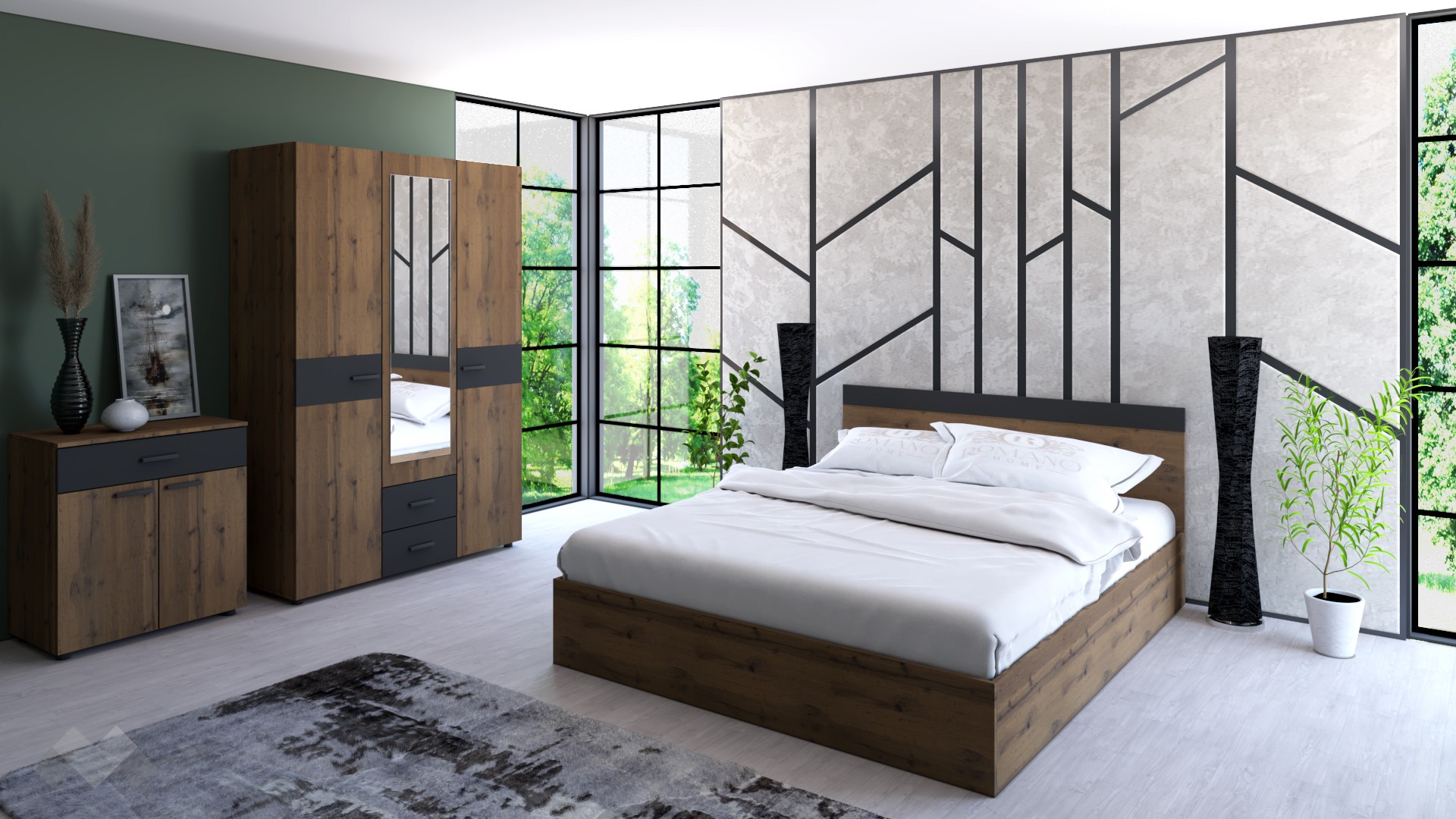 Спален комплект Дани D1 ще внесе усещане за стил и уют и ще направи спалнята ти мечтано кътче. Разполага с всичко, от което се нуждаеш – спалня, гардероб с отлично разпределение и скрин с чекмедже и шкафче с две вратички.