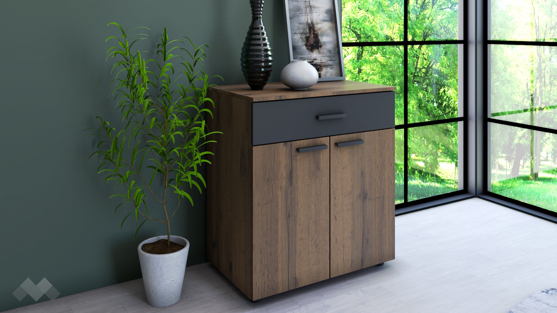 Скринът ти предлага 2 обемни шкафа с вратички и чекмедже. В него ще можеш да организираш цялата си козметика, малки ел. уреди или други вещи, от които се нуждаеш.