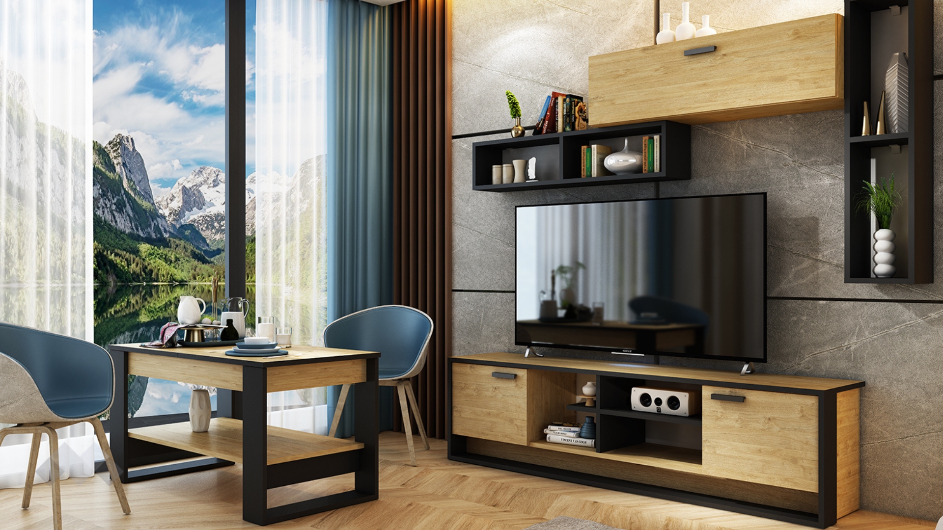 ⭐ Предимства: ✓ модерен дизайн ✓ ТВ шкаф ✓ окачен шкаф с вратичка ✓ етажерки с открити рафтове ✓ няколко варианта за монтаж ✓ качествена изработка ✓ плавно затваряне на вратичките ✓ 16 мм ПДЧ
