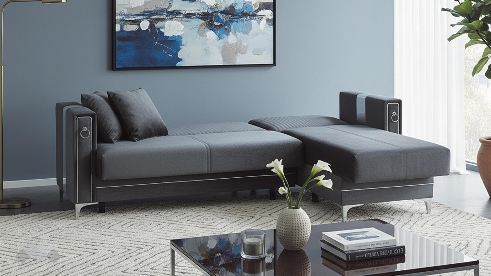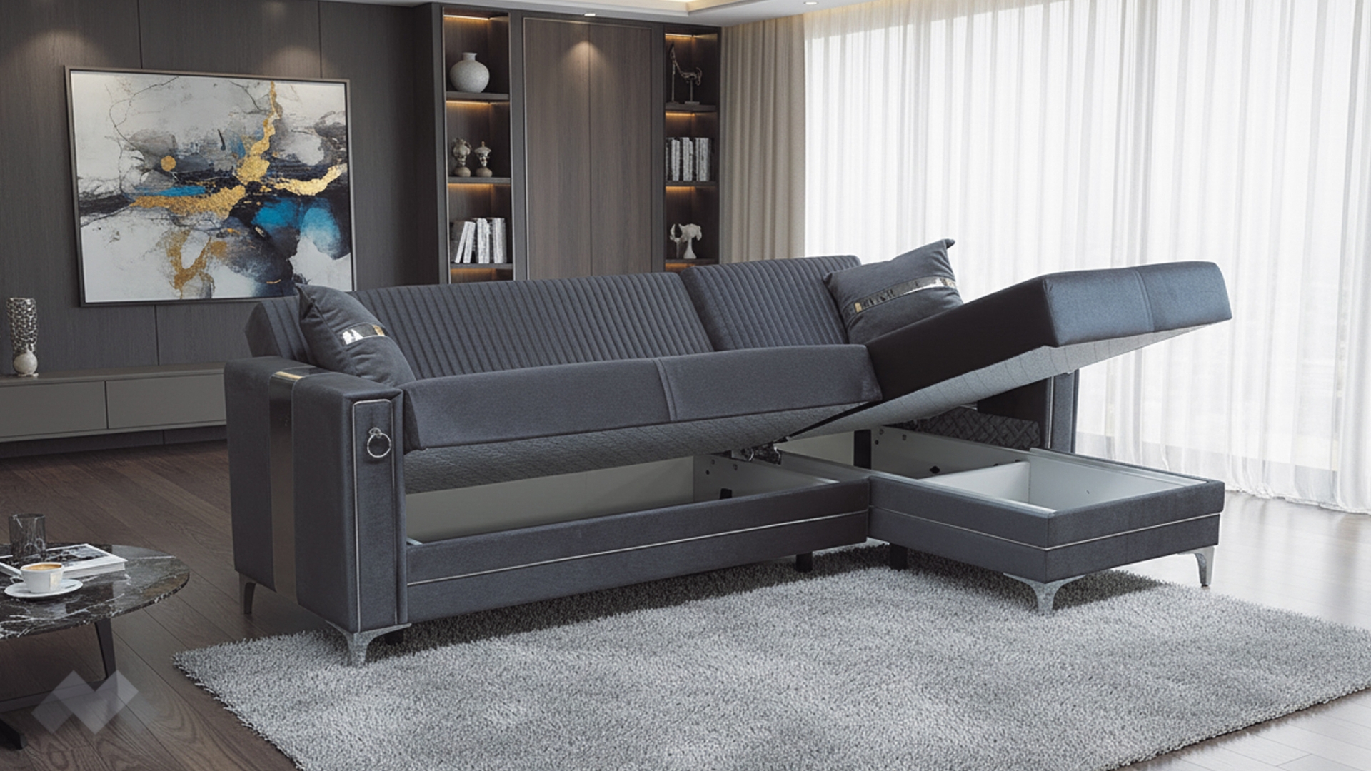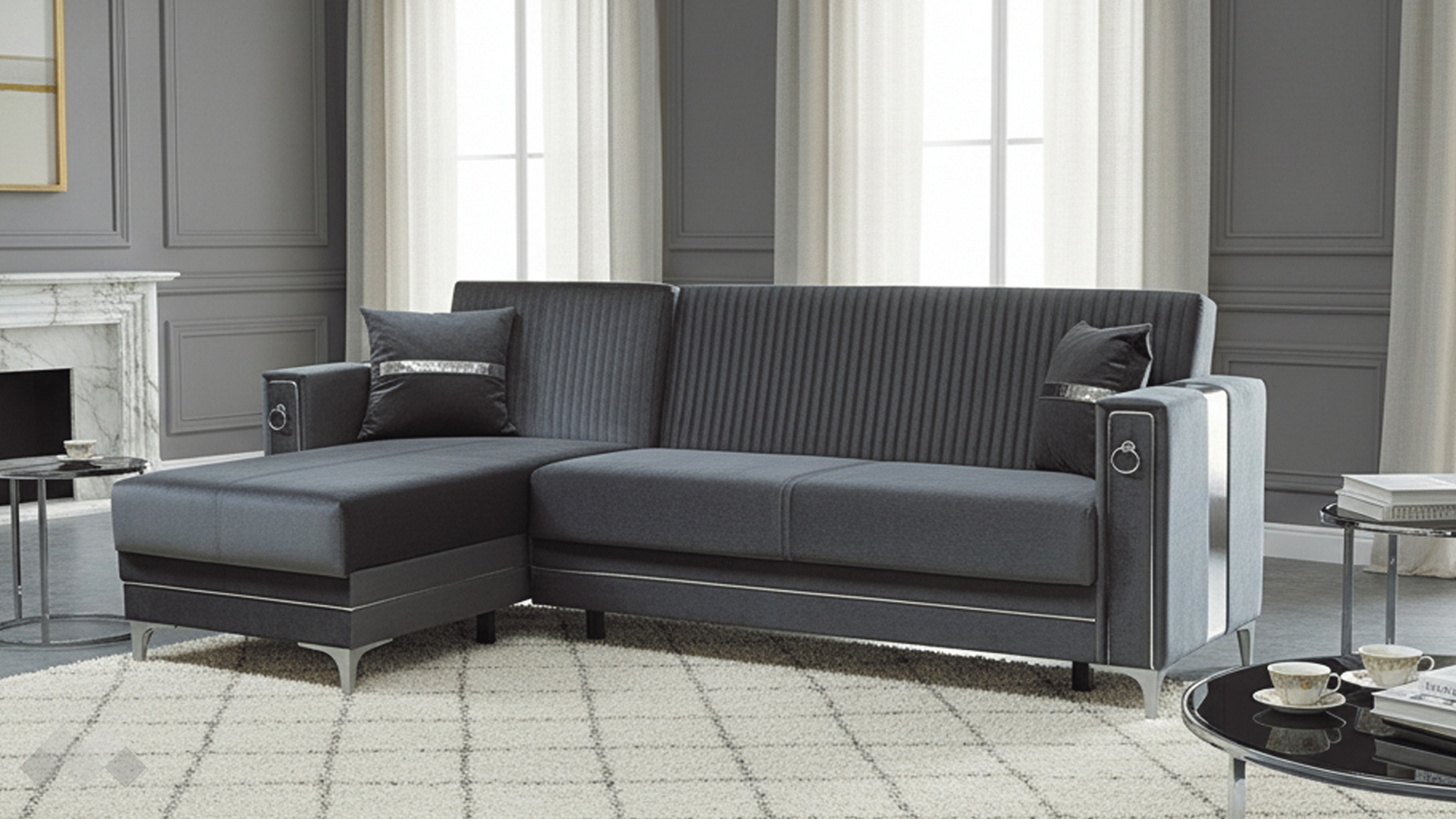 Освен стилен, Ъглов диван Дестини с унивесална посока е и функционален - с минимално усилие се превръща в комфортно и просторно легло с размери 105/210 см, благодарение на клик-клак механизъм. А под лежанката се крие просторна ракла, в която може да съхраниш завивки, още възглавници или вещи, които да са на една ръка разстояние.