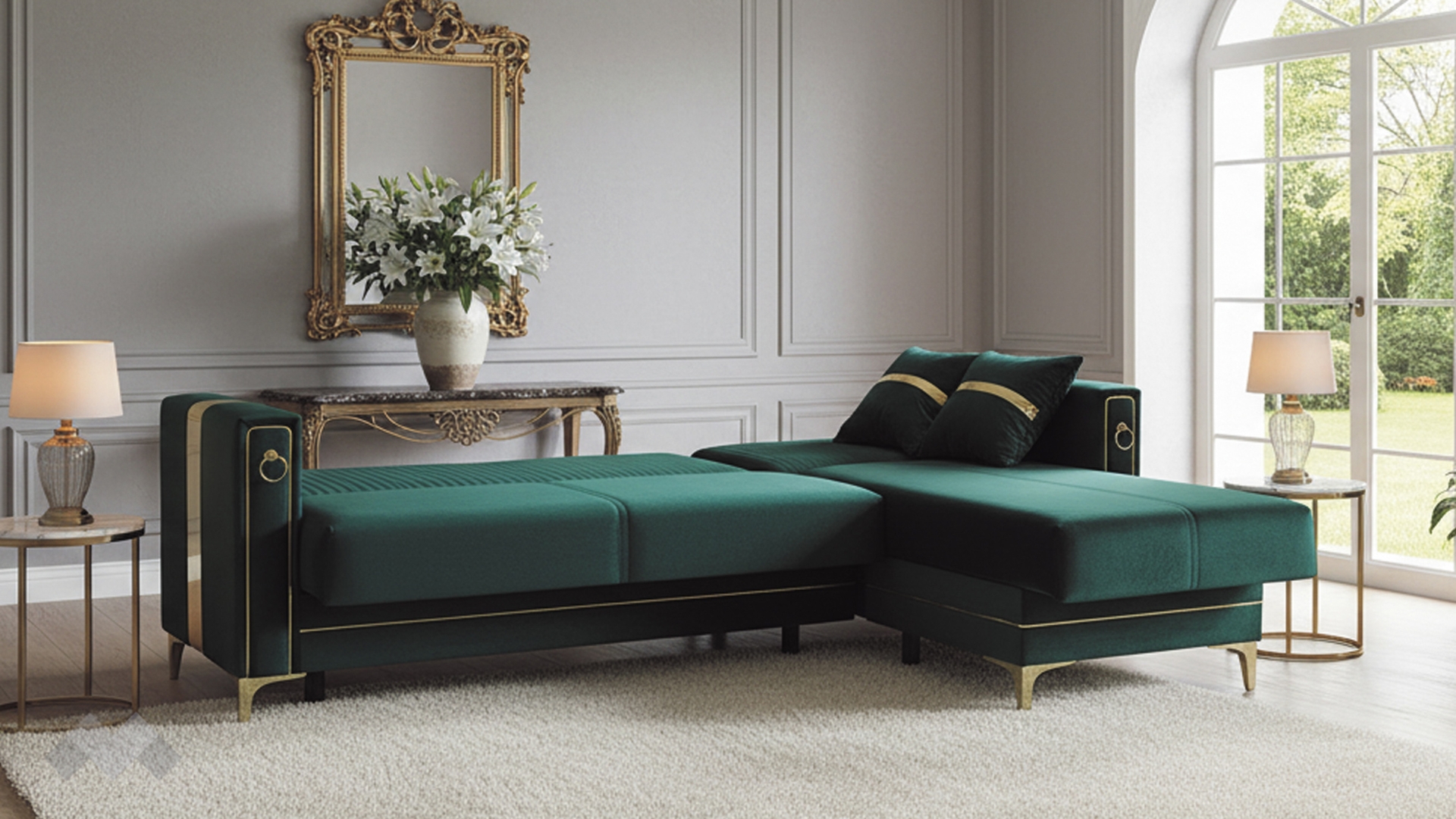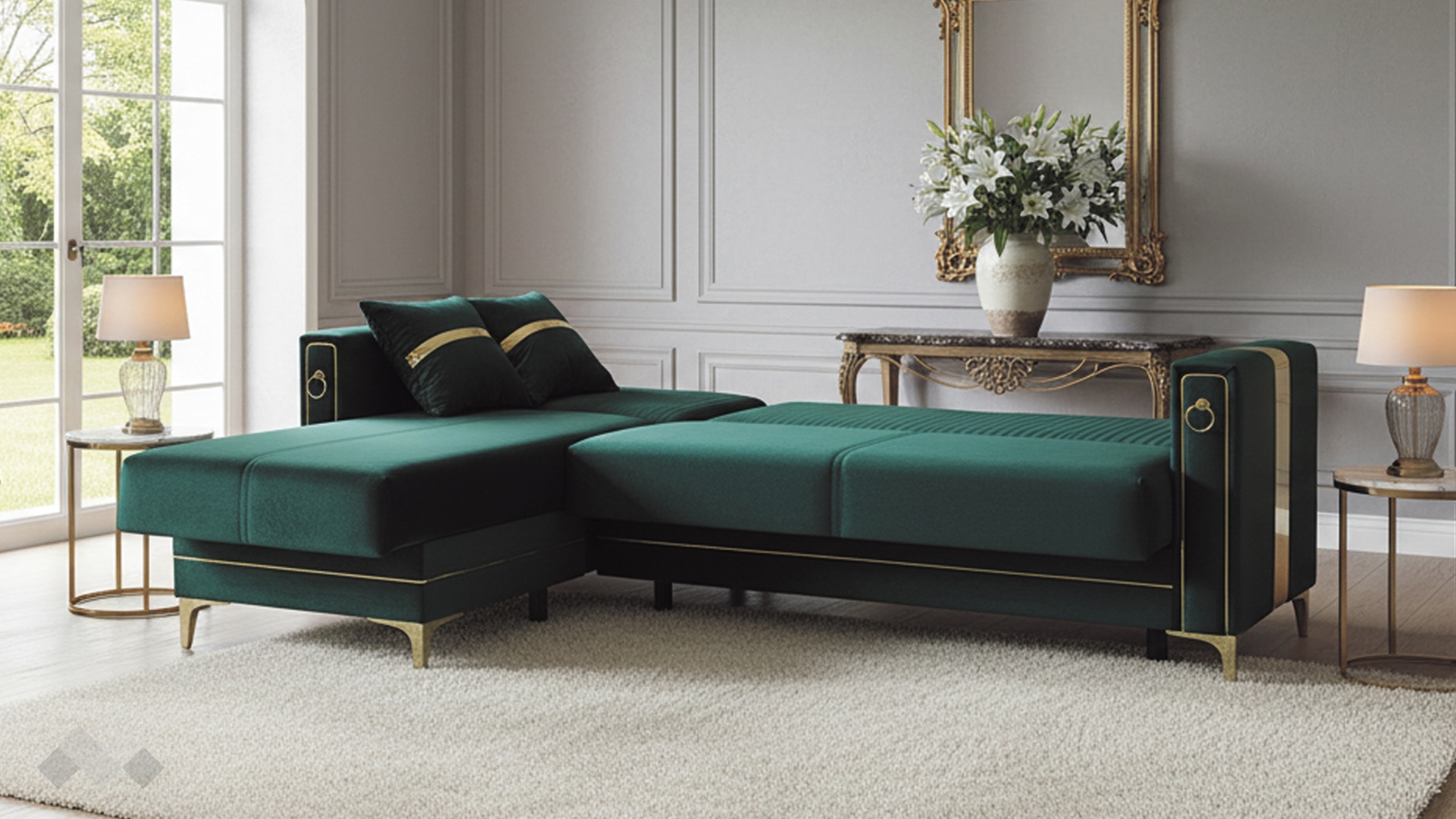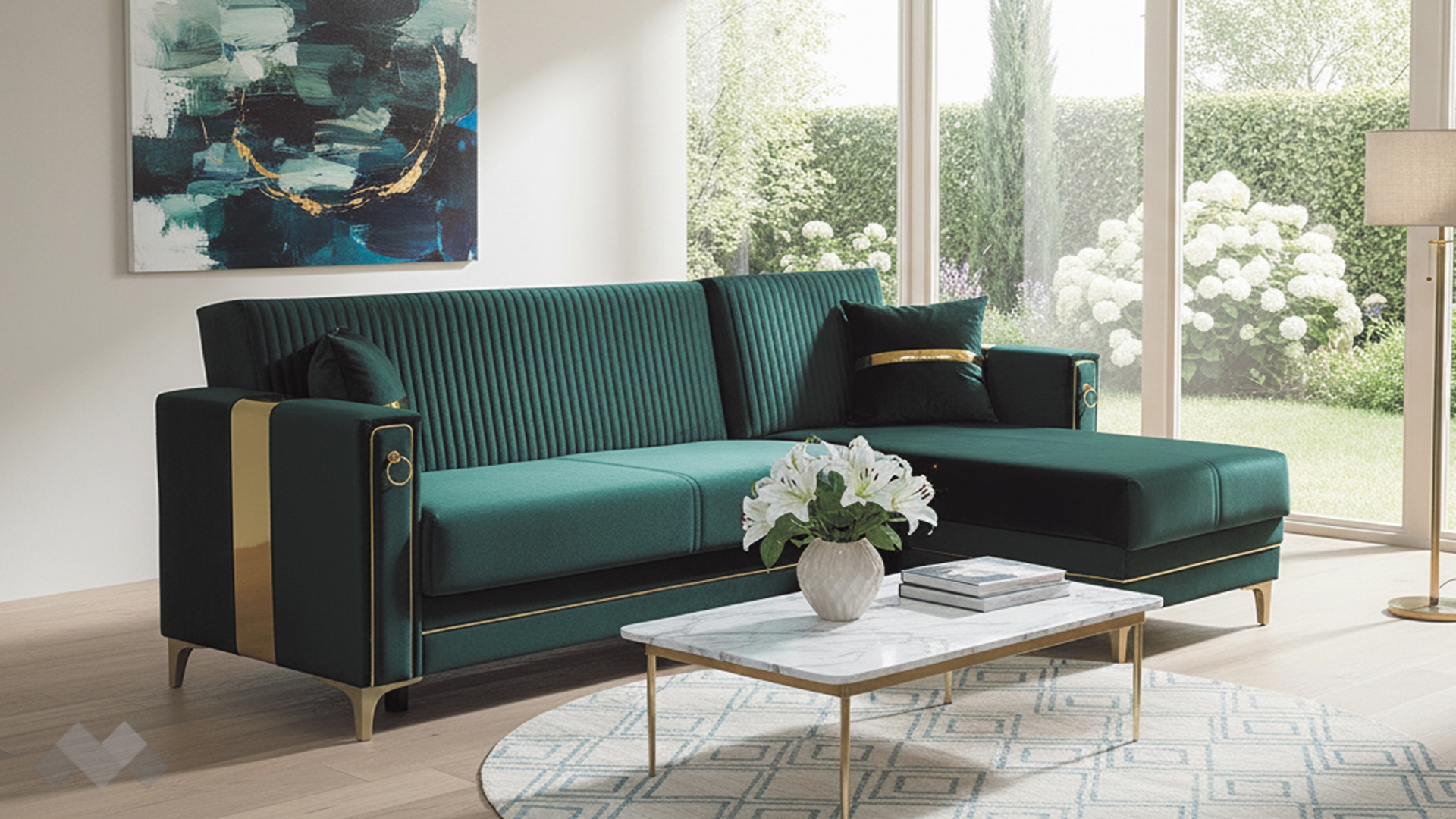 Облегалката е с фини вертикални шевове, които подчертават модерната линия на модела, а подлакътниците са декорирани със златисти орнаменти, добавящи допълнителен характер и завършен вид. Декоративните възглавнички със сребриста лента допълват усещането за елаганстност, осигуряват повече комфорт и завършват цялостната визия.