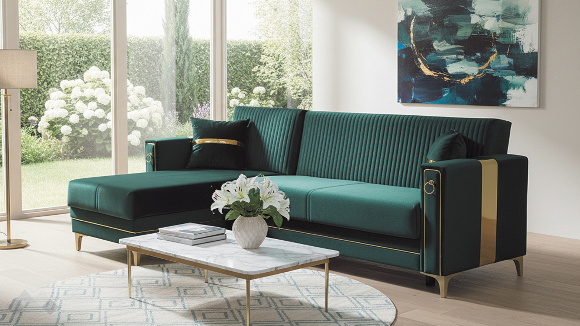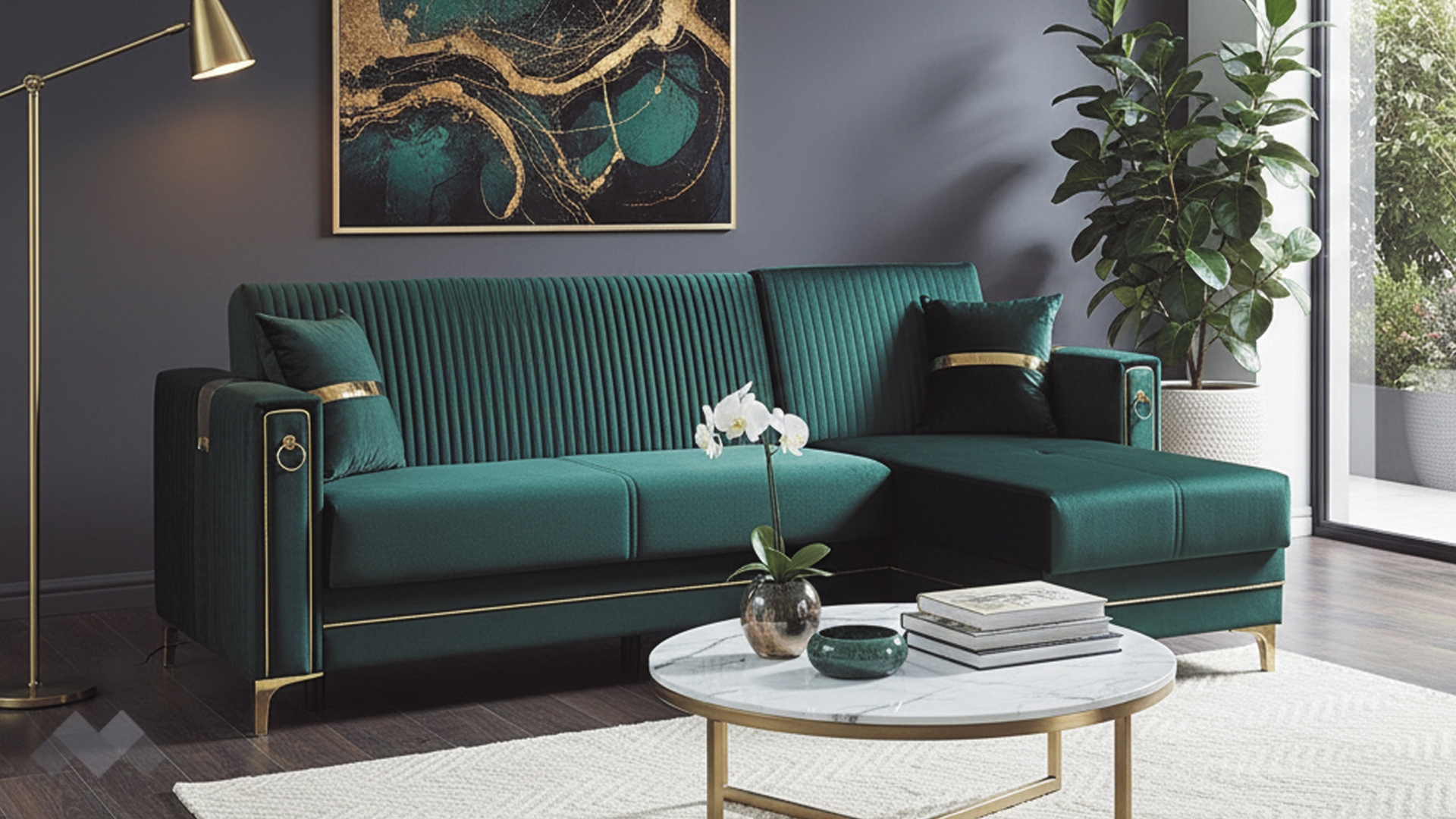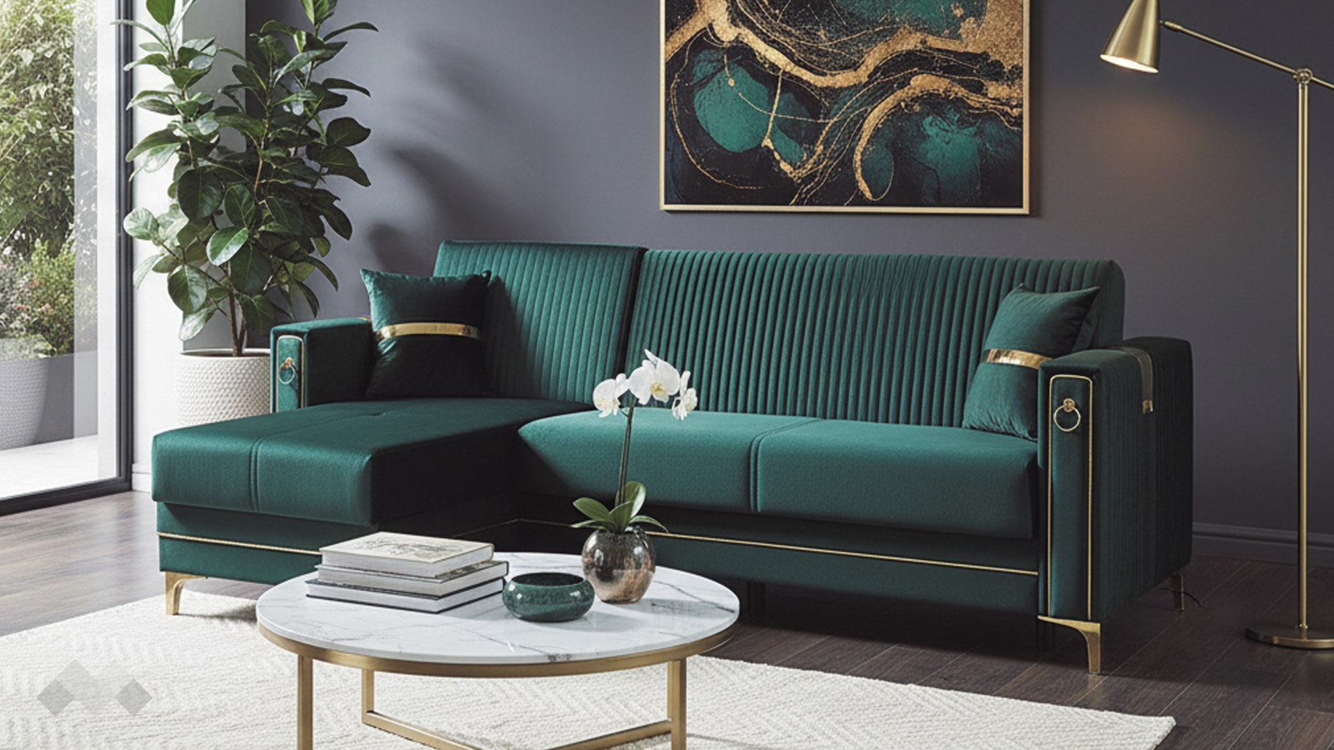 Облегалката е с фини вертикални шевове, които подчертават модерната линия на модела, а подлакътниците са декорирани със златисти орнаменти, добавящи допълнителен характер и завършен вид. Декоративните възглавнички със сребриста лента допълват усещането за елаганстност, осигуряват повече комфорт и завършват цялостната визия.