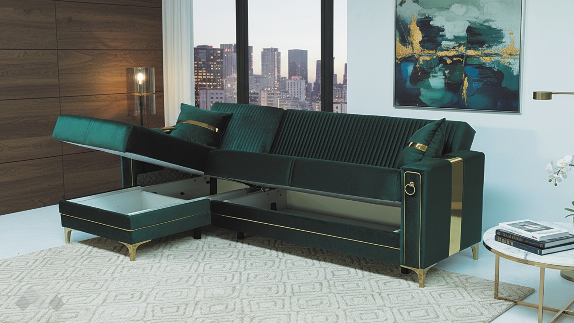 Освен стилен, Ъглов диван Дестини с унивесална посока е и функционален - с минимално усилие се превръща в комфортно и просторно легло с размери 105/210 см, благодарение на клик-клак механизъм. А под лежанката се крие просторна ракла, в която може да съхраниш завивки, още възглавници или вещи, които да са на една ръка разстояние.