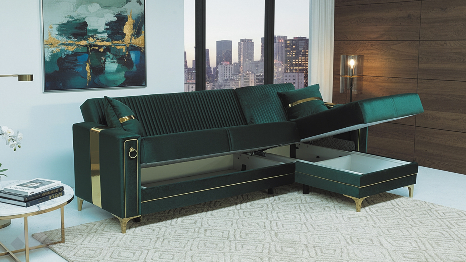 Изискан и елегантен, ъглов диван Дестини, впечатлява с изключително внимание към детайла. Моделът комбинира наситени цветове с изящни златисти акценти, които му придават исискан стил и създават усещане за класa и елегантност.