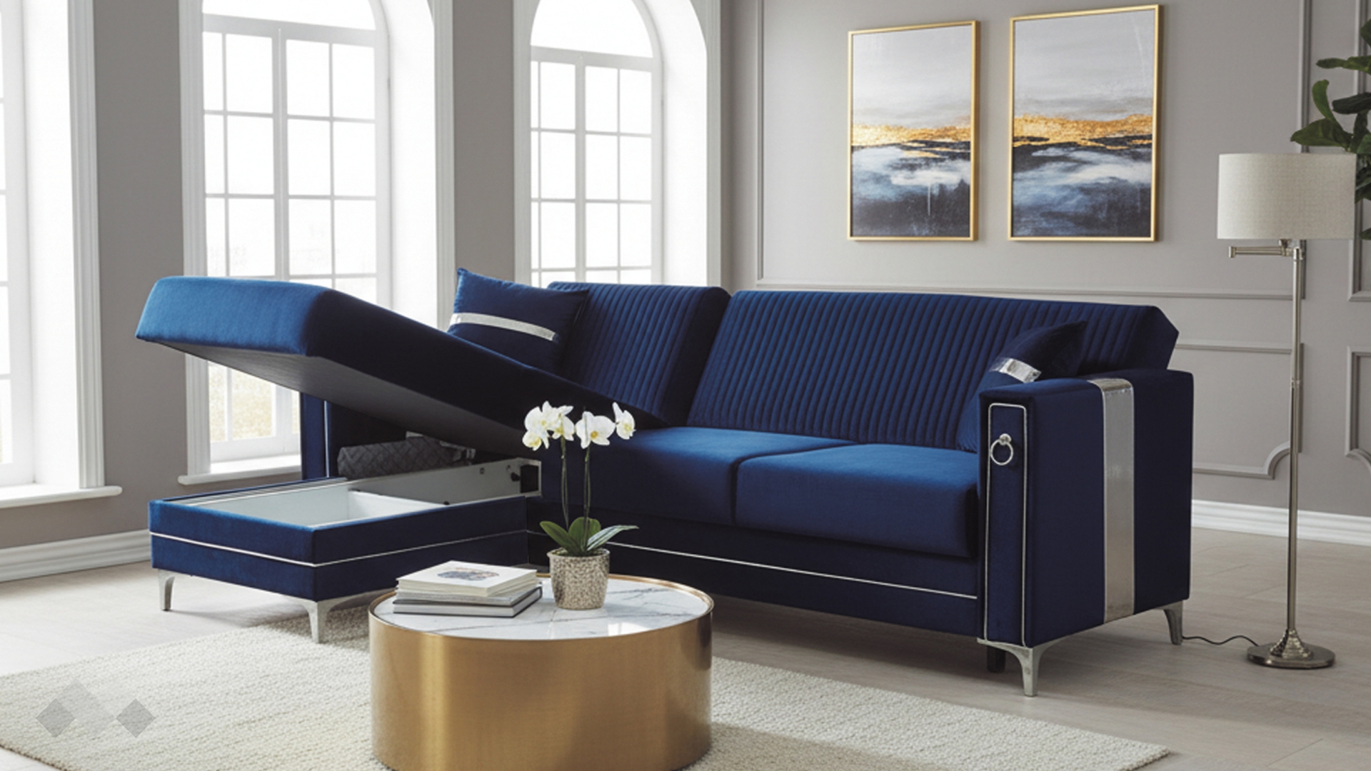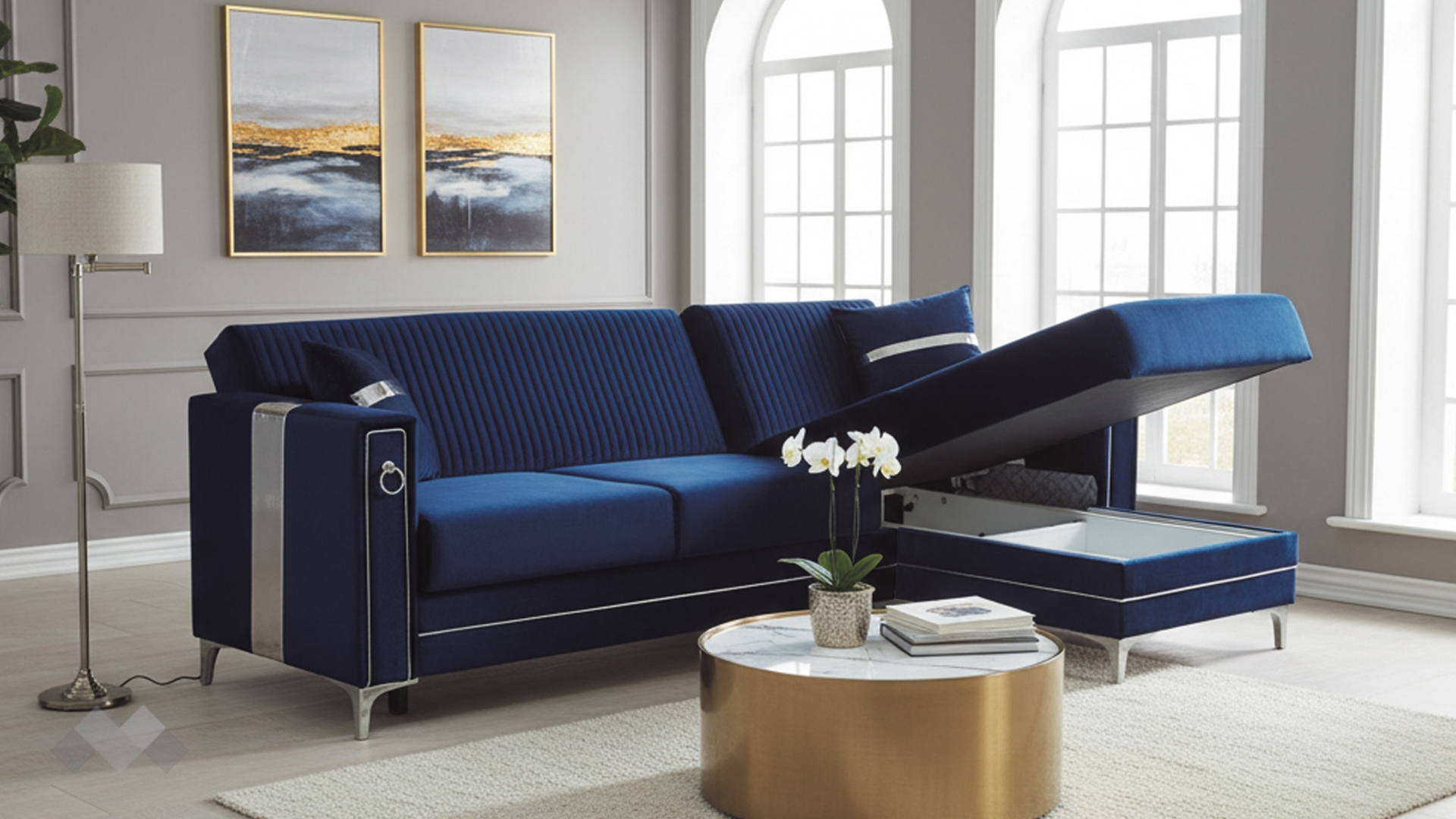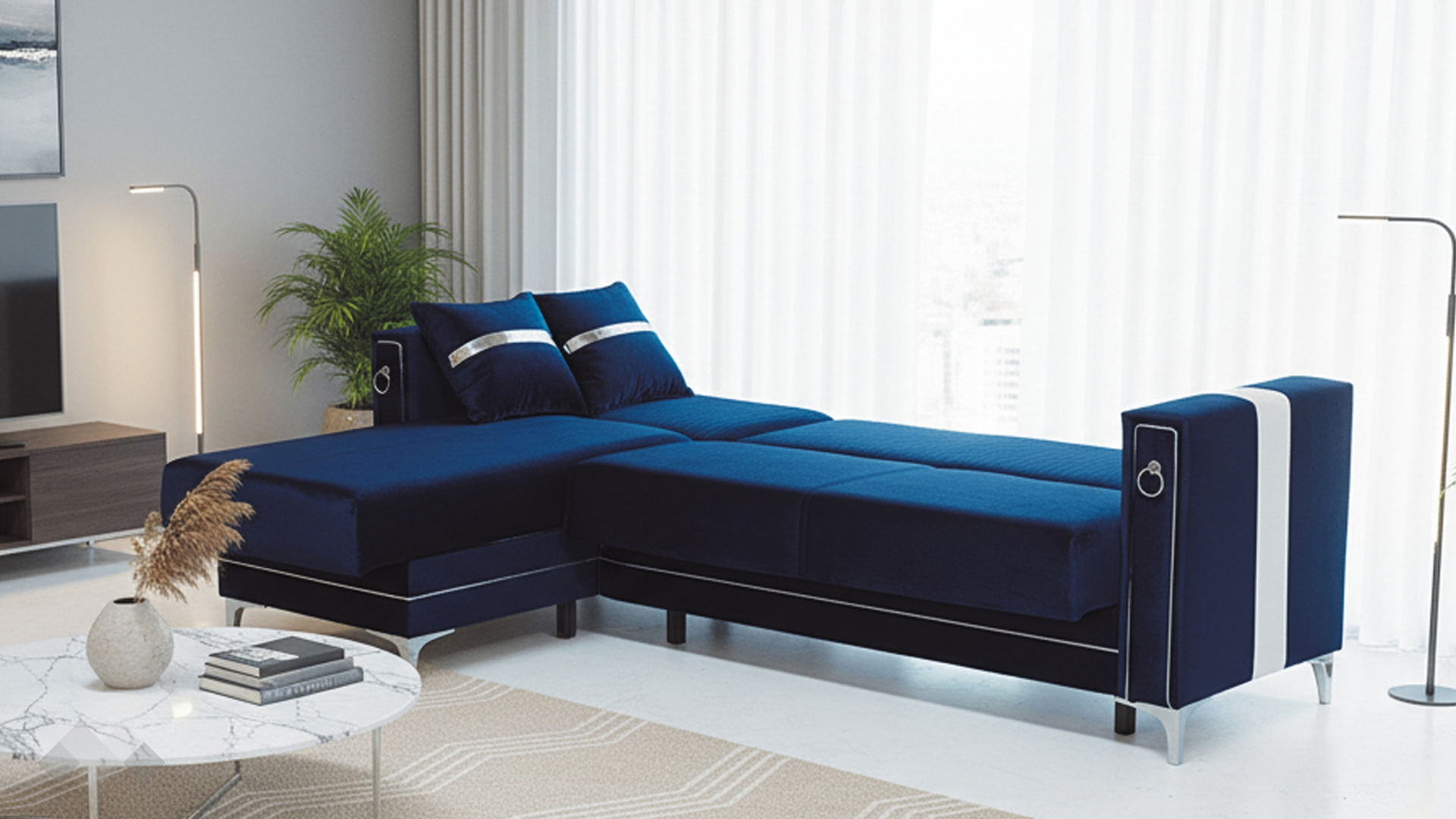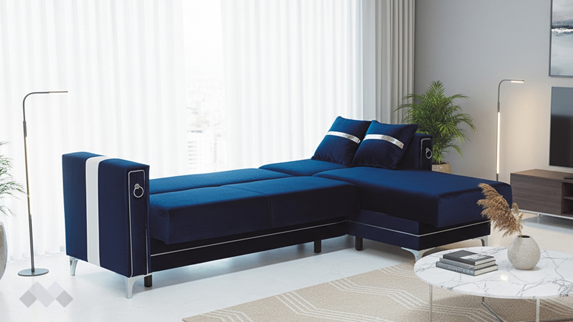 Освен стилен, Ъглов диван Дестини с унивесална посока е и функционален - с минимално усилие се превръща в комфортно и просторно легло с размери 105/210 см, благодарение на клик-клак механизъм. А под лежанката се крие просторна ракла, в която може да съхраниш завивки, още възглавници или вещи, които да са на една ръка разстояние.