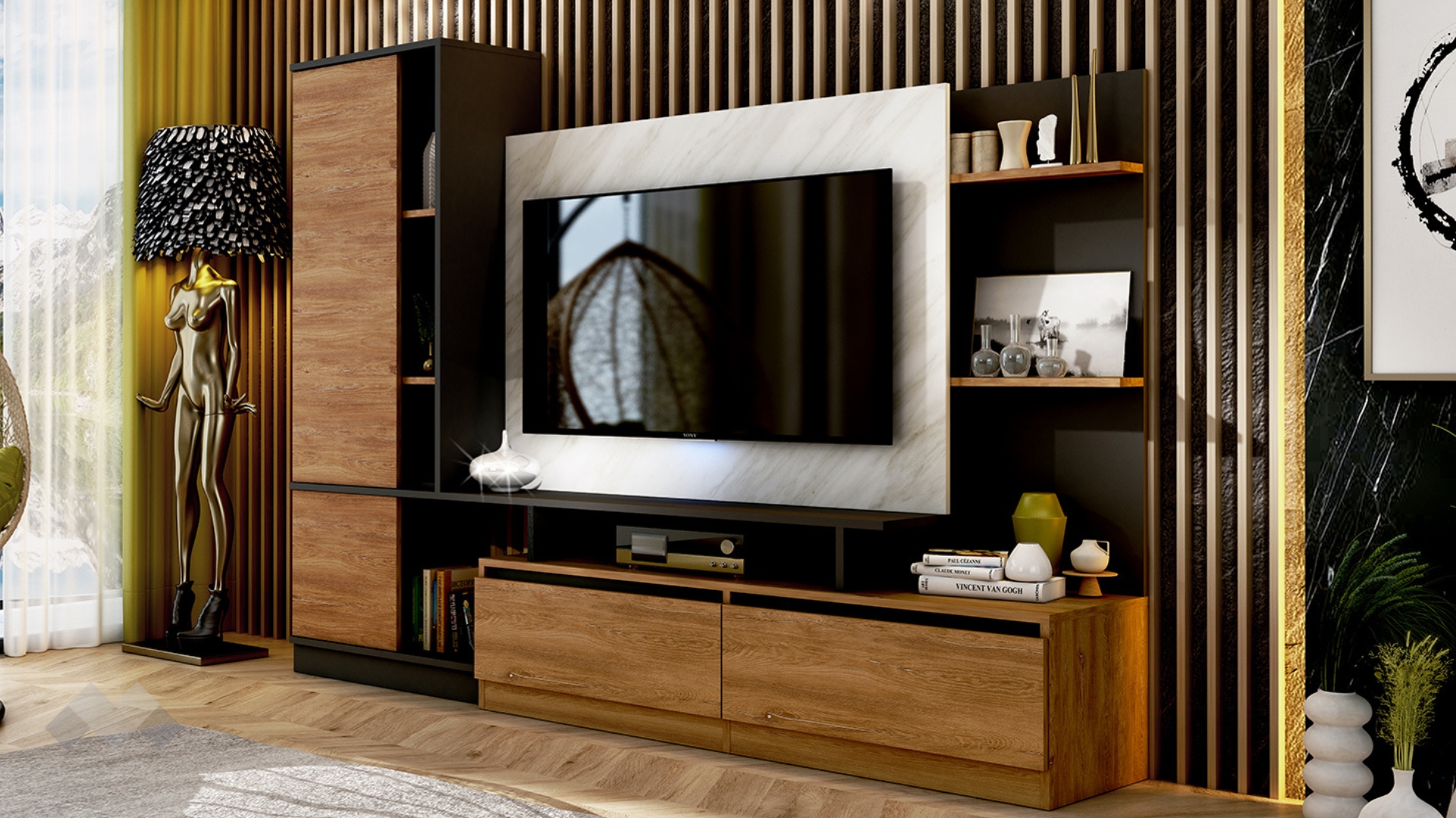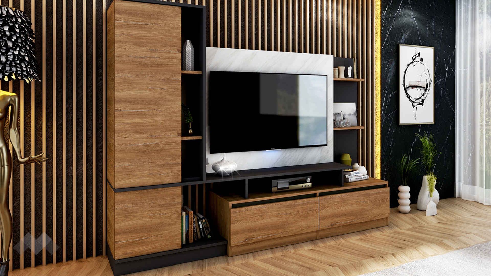 Секция Джаз разполага с висока етажерка, където да поставиш различни предмети. Предлага и голямо място за съхранение със затворени вратички, където да организираш други вещи, които да останат скрити от погледите. Етажерките, разположени отстрани, са прекрасен начин да създадеш допълнително пространство за книги, скъпи спомени като фотографии или сувенири, а може и да аранжираш със стилни декорации и украси – изборът е твой.