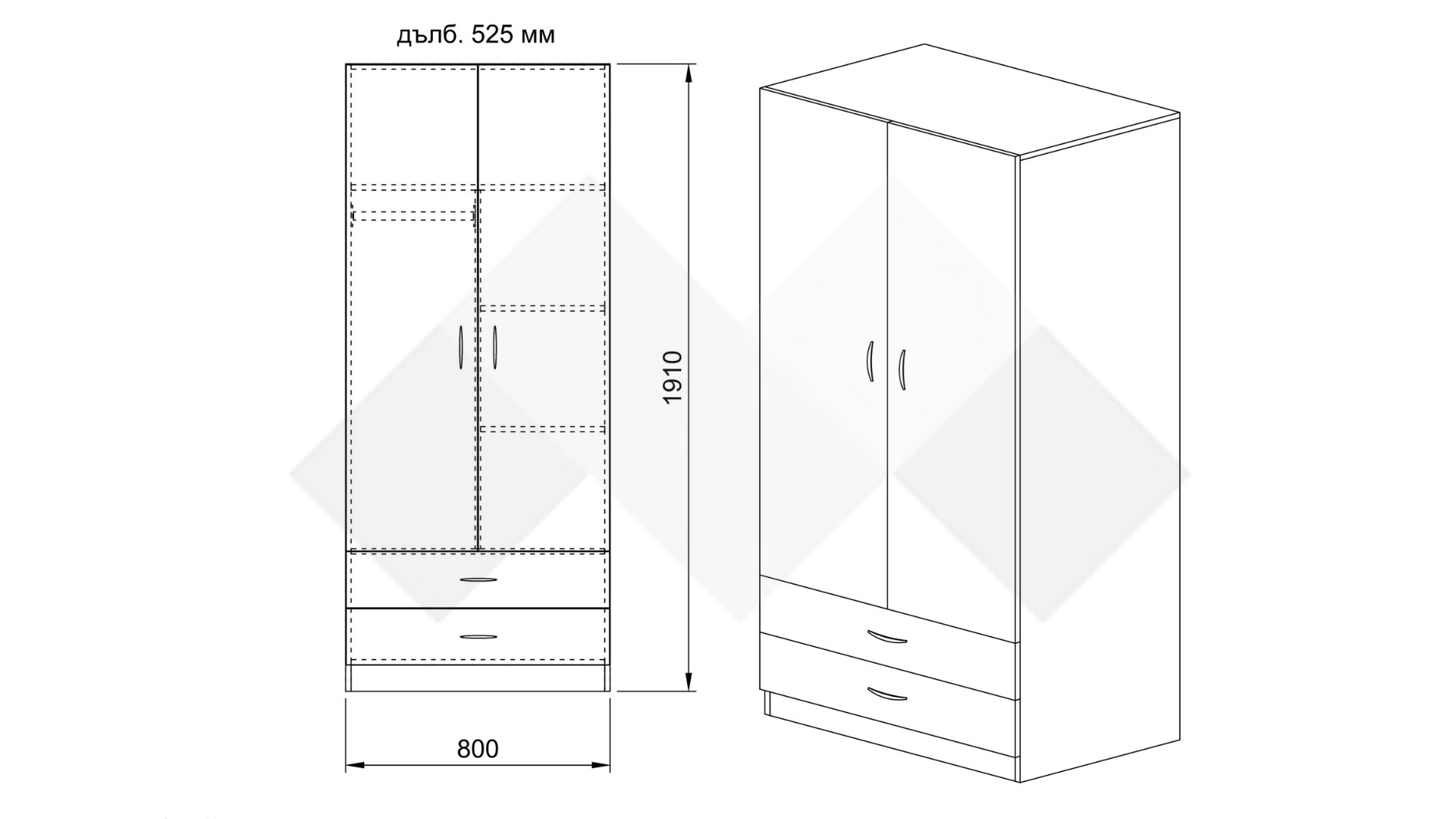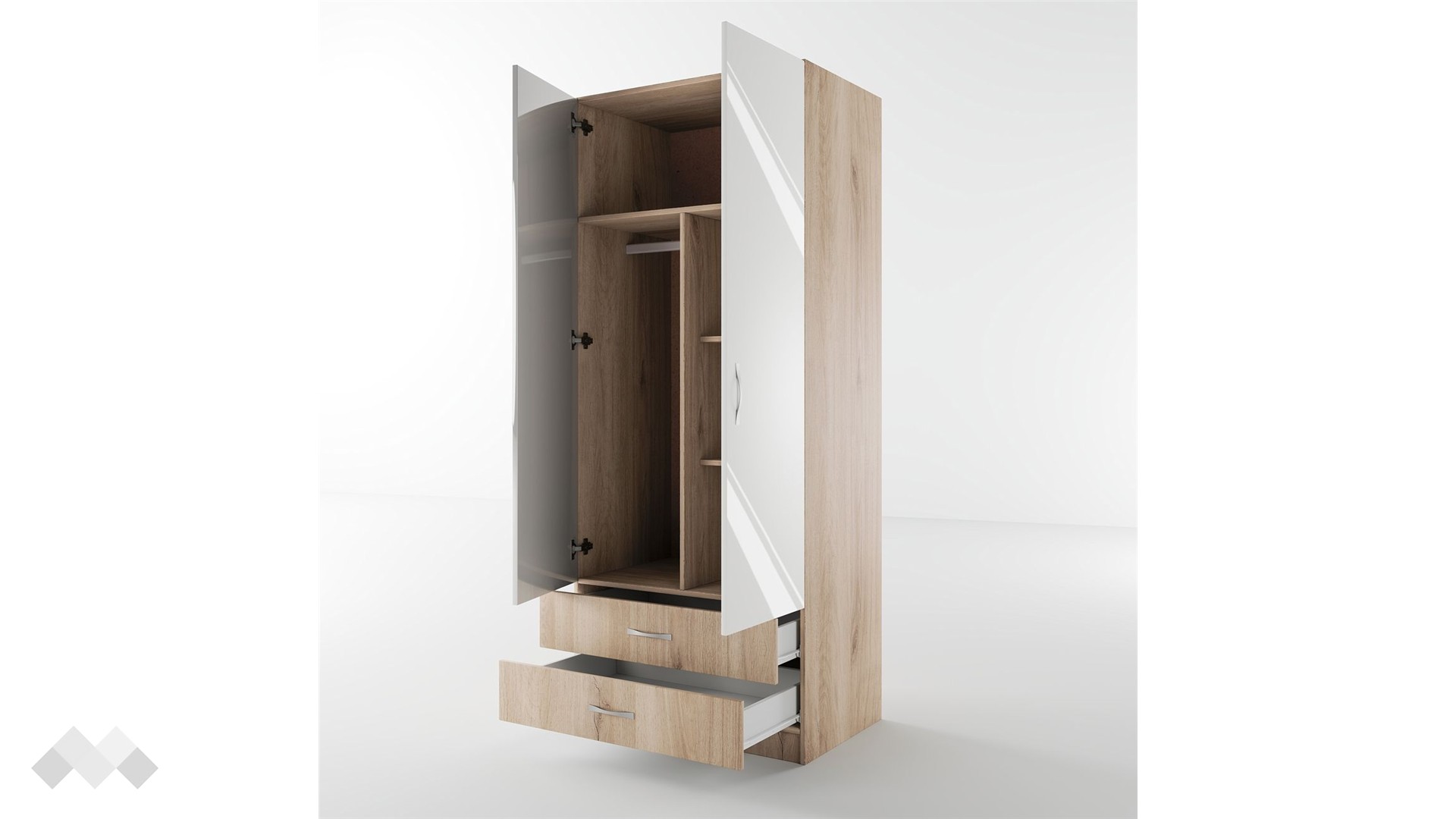 ✓ двукрилен ✓ 2 чекмеджета ✓ 4 рафта ✓ лост за закачалки ✓ механизъм за плавно затваряне ✓ модерен декор ✓ практично разпределение ✓ качествена изработка