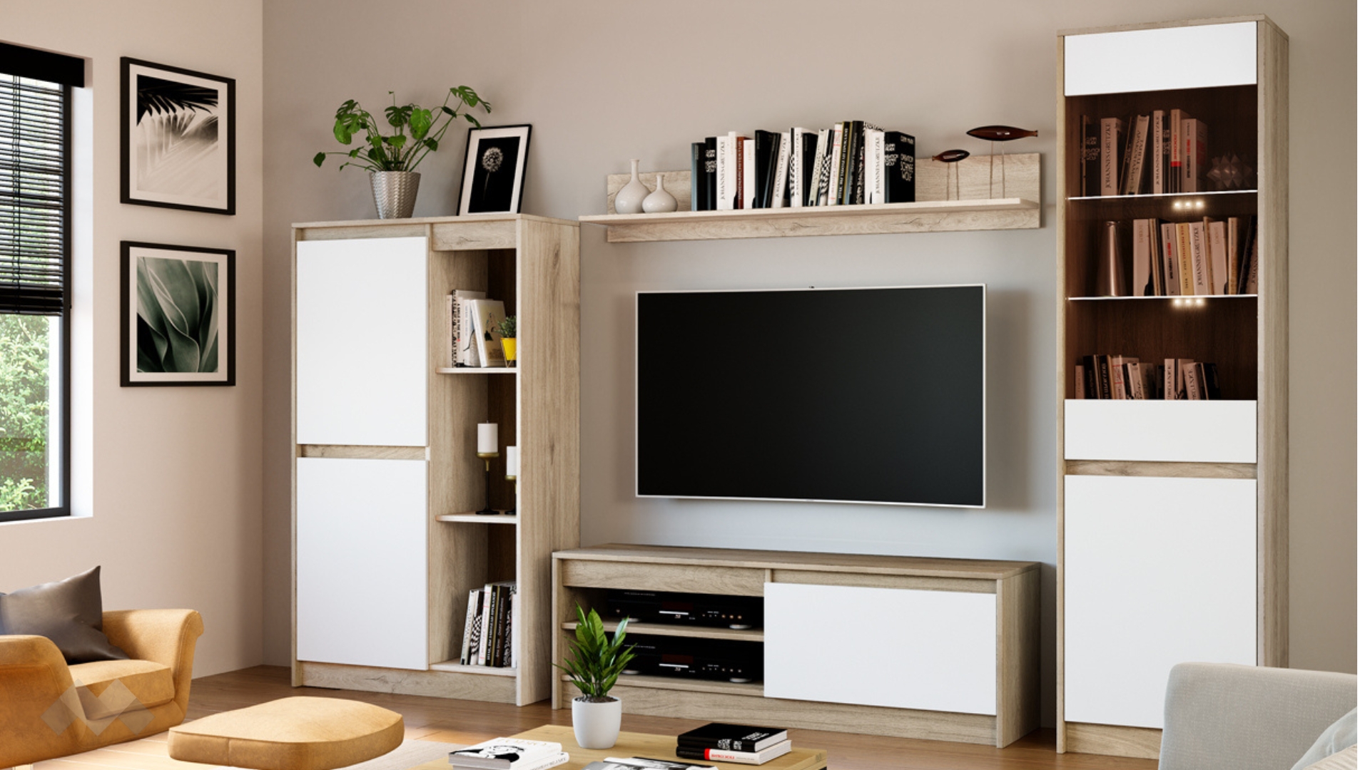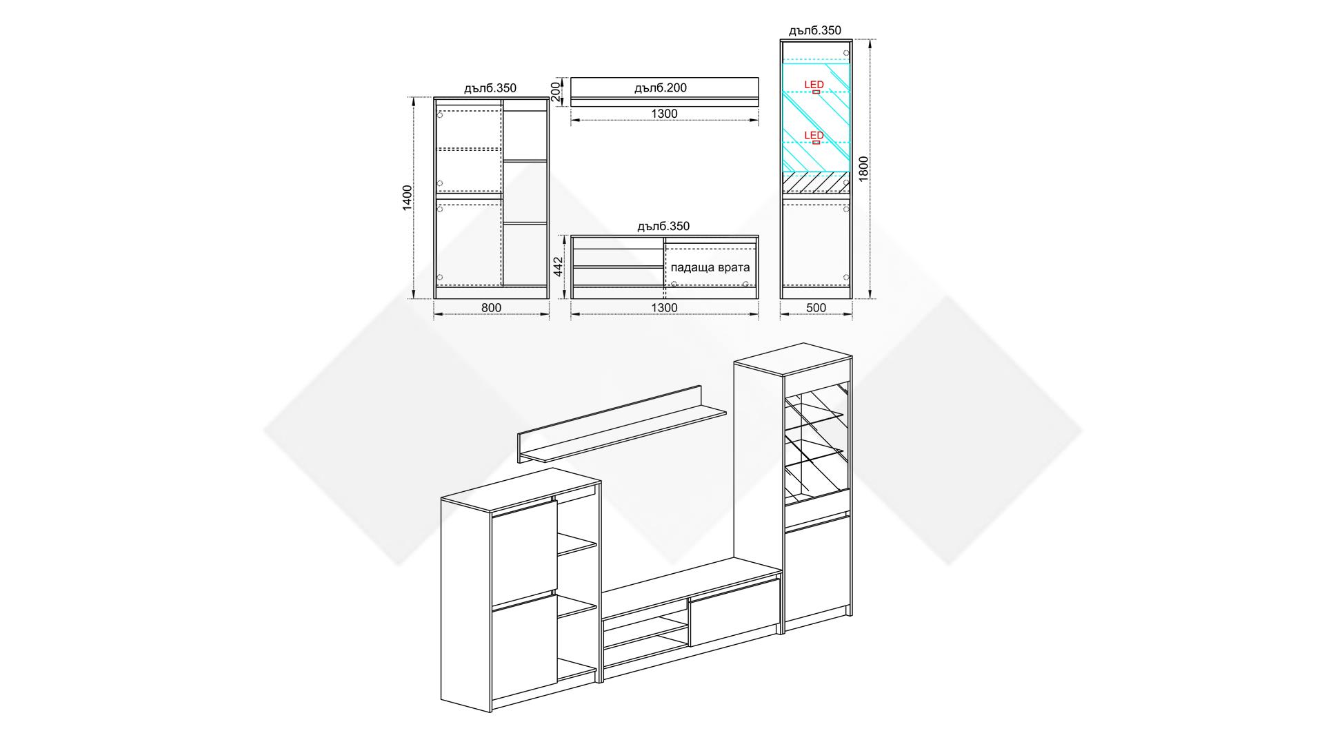 ТВ шкафът ти предлага 2 отворени рафта и шкаф с падаща врата, в него ще намериш място за цялата ти съпътстваща техника. В стъклената витрина можеш да подредиш ценни вещи, които не искаш да остават скрити от погледите, но и ще са на сигурно място. А LED осветлението в нея допълнително ще акцентира върху вещите. Под нея ще намериш обемен шкаф с врата за съхранение на вещи. Високият шкаф разполага с 2 открити рафта и 2 шкафа с вратички. Върху етажерката можеш да подредиш книги, фотографии или стилна декорация – изборът е твой!