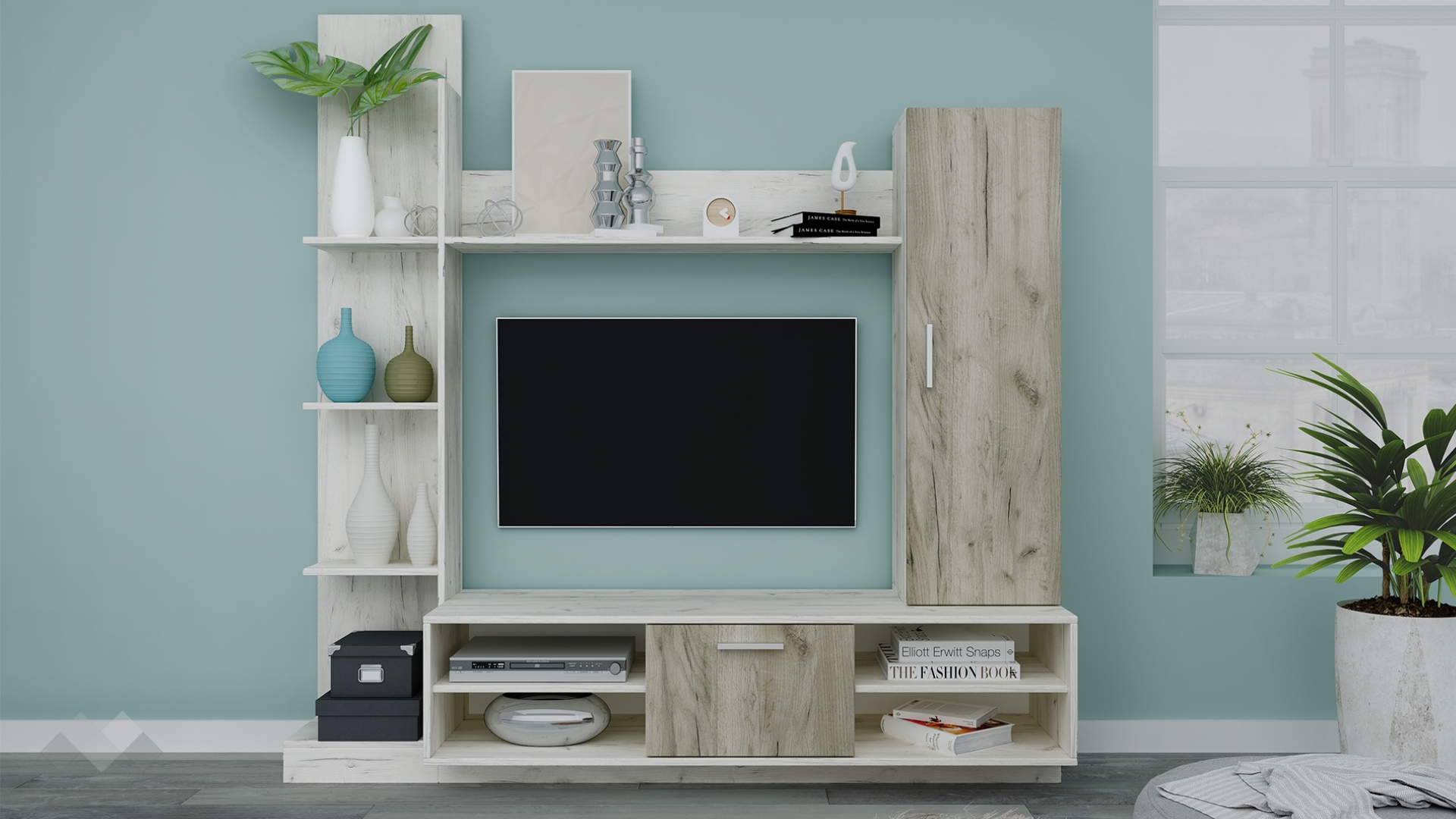 Секцията ти предлага всичко от което се нуждаеш – ТВ шкаф с отворени рафтове и шкаф с вратичка за цялата ти съпътстваща техника, висок шкаф и открити рафтове - върху откритите рафтове можеш да подредиш книги или красиви предмети, а в шкафчето с врата вещите, които искаш да останат скрити. Върху етажерката можеш да разположиш любими снимки, сувенири от приятни пътувания или модерна декорация – изборът е твой!