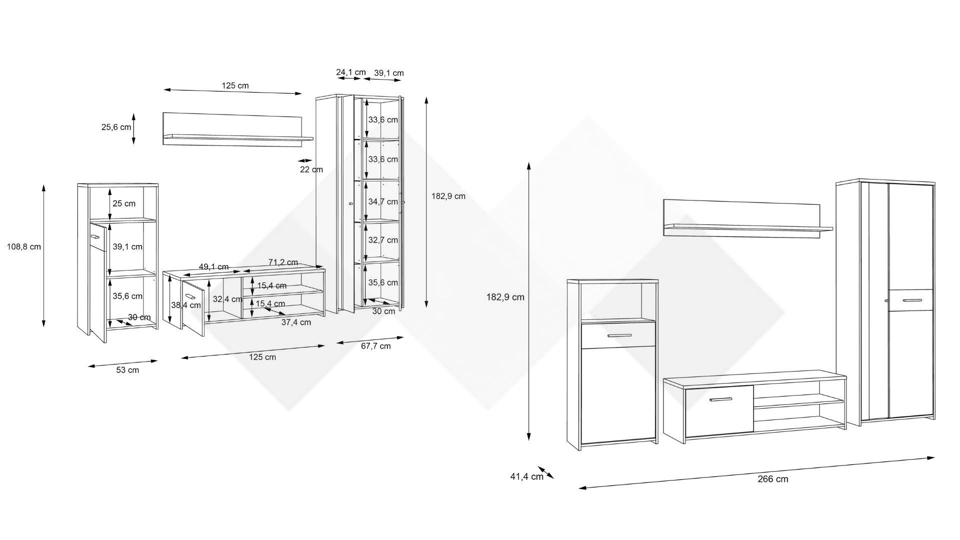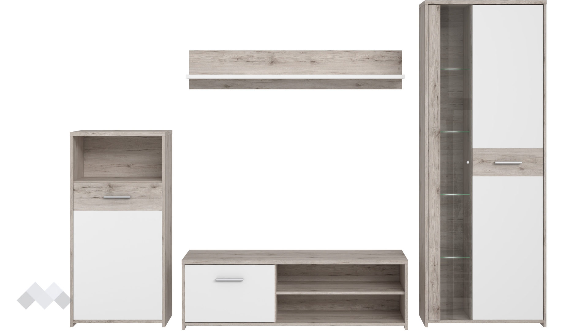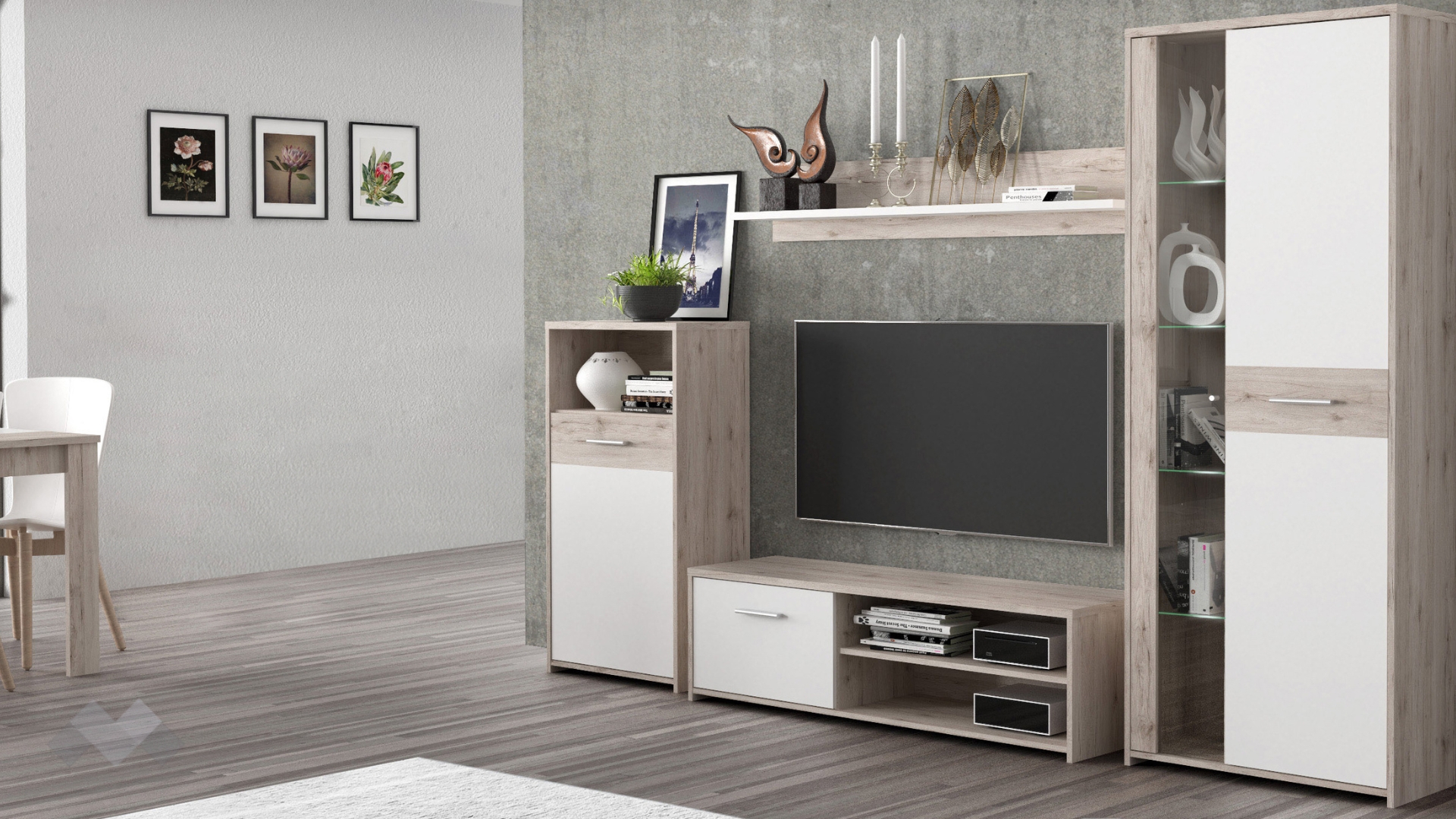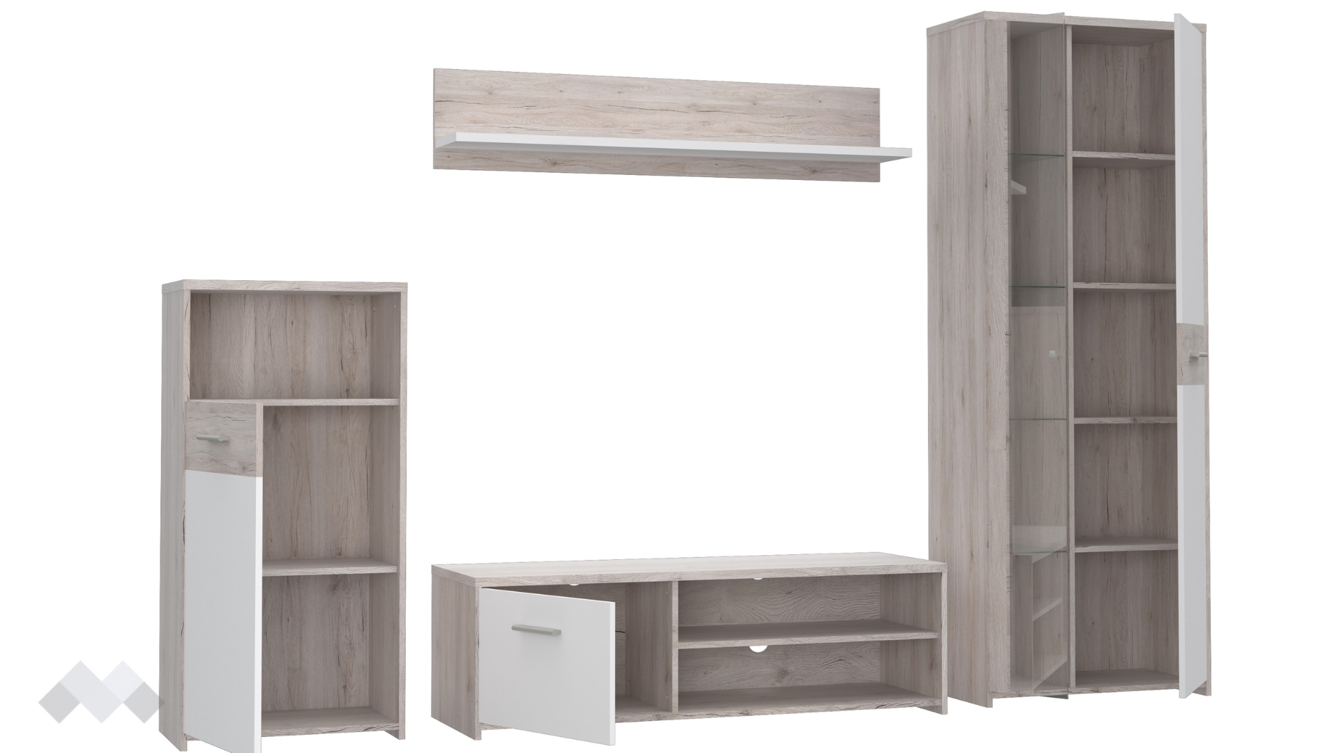 ⭐ Предимства: ✓ модерна цветова комбинация ✓ гардероб ✓ затворен шкаф ✓ ТВ шкаф ✓ етажерка ✓ витрина ✓ отворени рафтове ✓ качествена изработка ✓ 15 мм ПДЧ