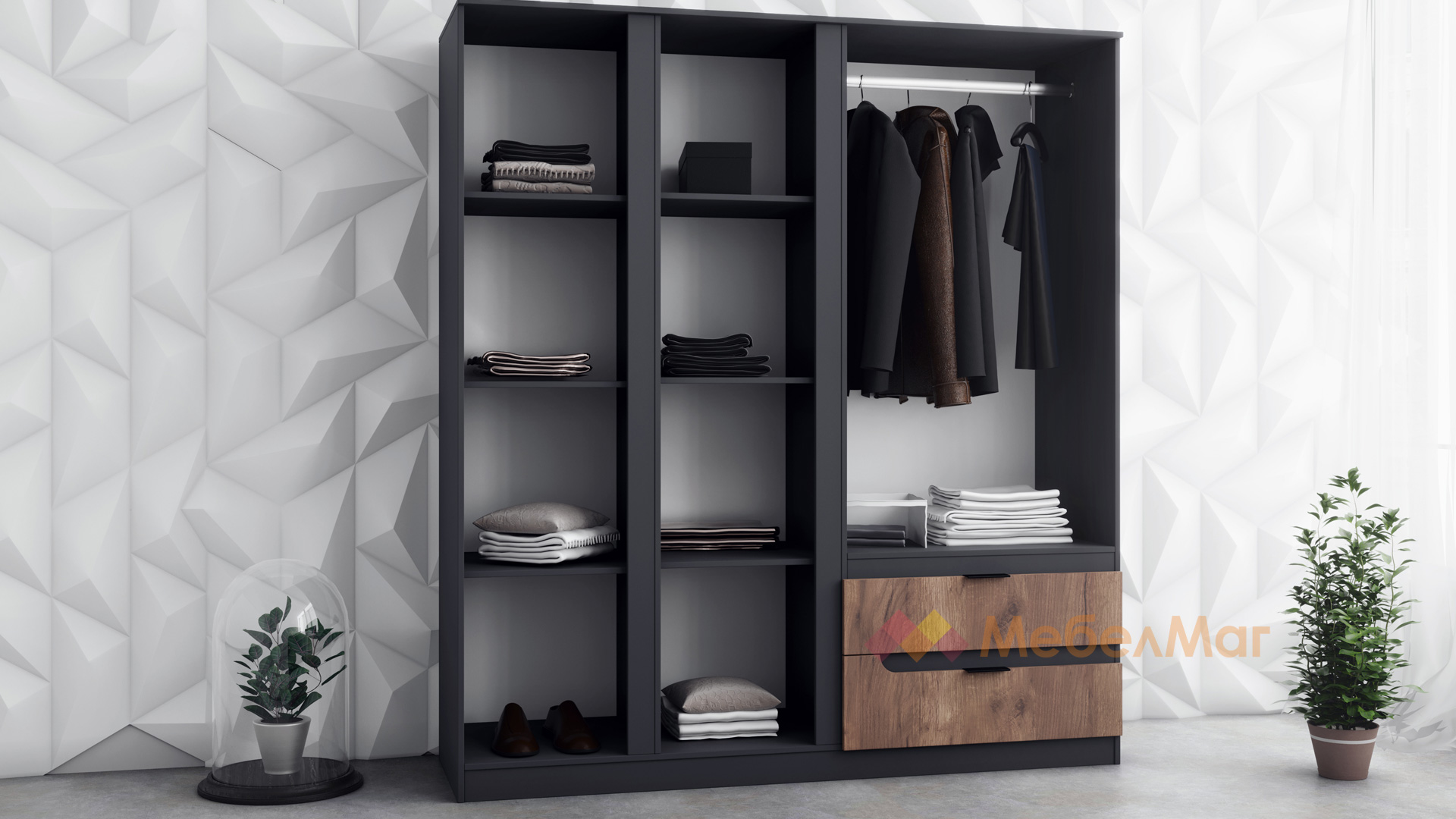Голямото предимство на този спален комплект е функционалният четирикрилен гардероб. Той ти предлага – лост, 6 рафта и 2 чекмеджета.