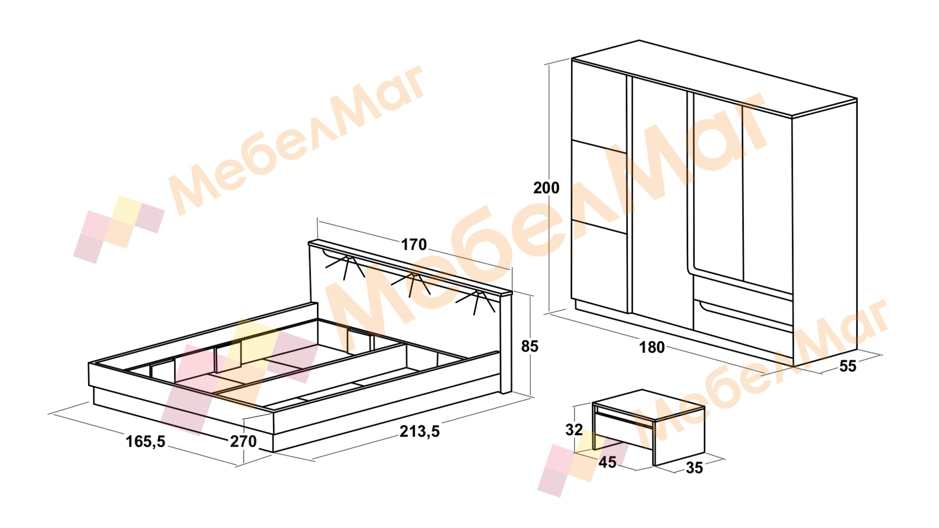 Спалня: Д: 213.7 см Ш: 170 см В: 85 см