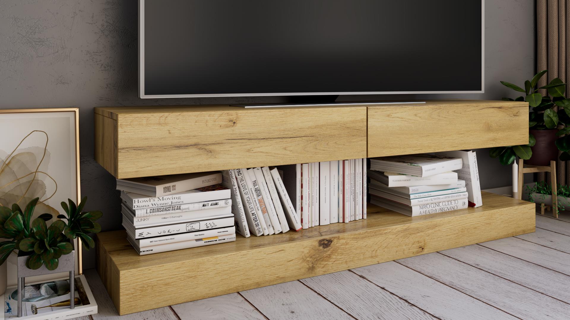 ТВ шкафът се състои от два модула, които можеш да позиционираш по твой избор и вкус. Горният модул разполага с удобен плот, на който можеш да поставиш своя телевизор, както и с две чекмеджета, в които можеш да прибереш игри, дискове, кабели или други вещи, които да са ти под ръка. Долният модул представлява отворен рафт и е чудесно място за любимите книги и сувенири. Също така е подходящ за организиране на ТВ приемници, DVD плейъри или друга съпътстваща техника.