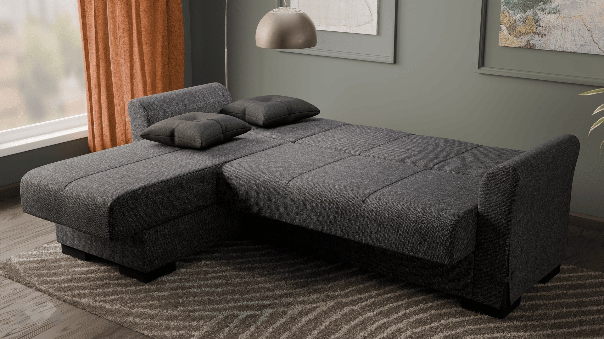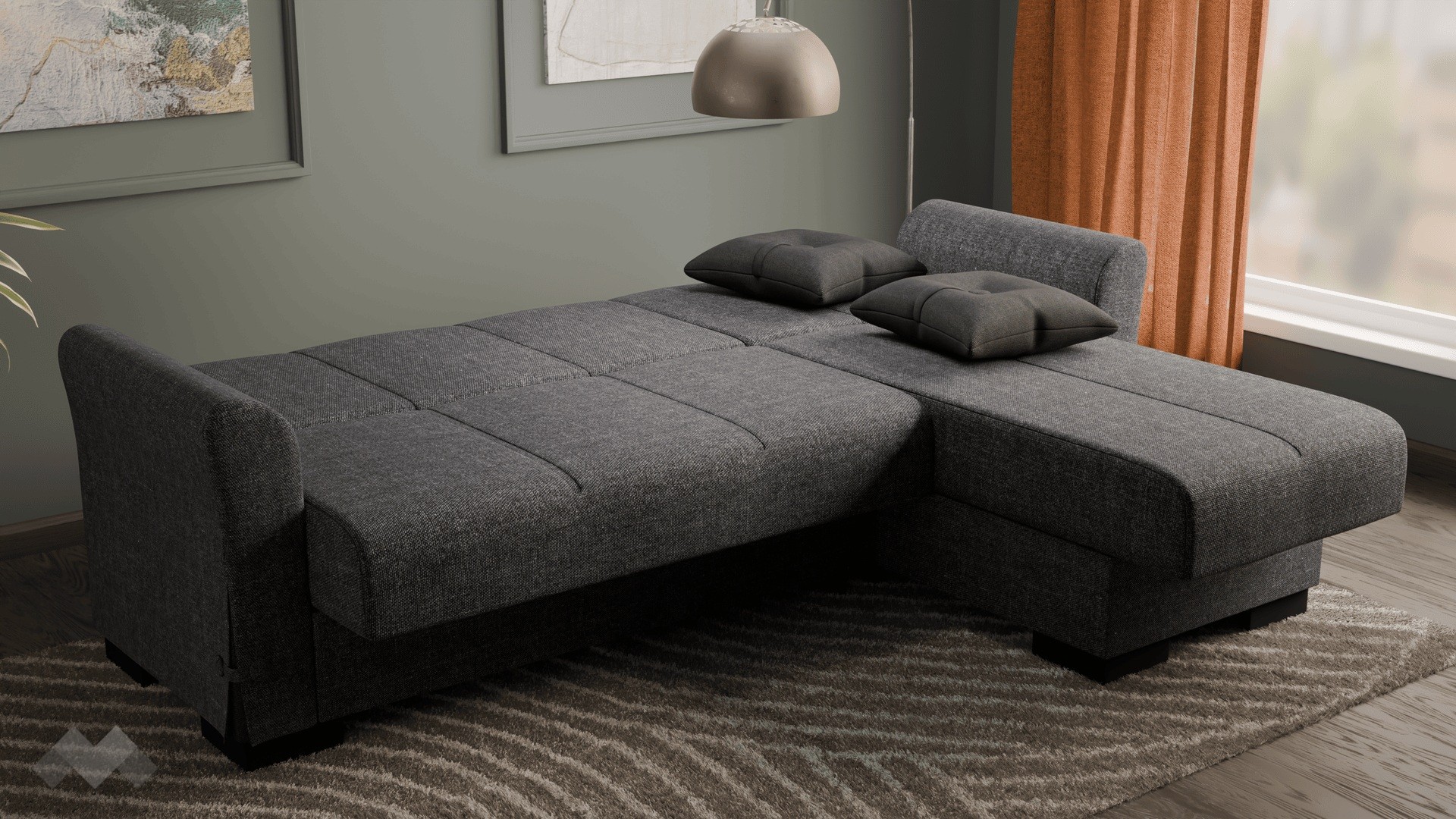 Благодарение на клик-клак механизма, диванът се трансформира бързо и лесно в удобно легло с размери 180/107 см. Само с едно движение можеш да го разгънеш или прибереш, което го прави изключително удобен за ежедневна употреба или за настаняване на гости. Под седалната част и под лежанката ще откриеш още един практичен плюс – удобни ракли, в които можеш да съхраняваш завивки, възглавници и други вещи. Дамаската е приятна на допир, изработена от здрав и устойчив текстил.