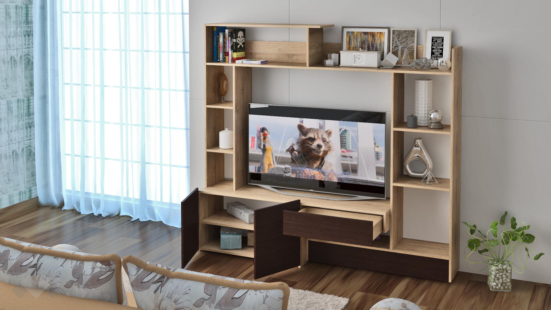 ⭐ Предимства: ✓ компактна и функционална ✓ практично разпределение ✓ семпъл и елегантен дизайн ✓ комбинация от класически светъл и тъмен декор ✓ подходяща и за по-малки жилища ✓ открити рафтове ✓ етажерка ✓ ТВ шкаф с място за ТВ - 104/90 см ✓ чекмедже ✓ качествена изработка ✓ 16 мм ПДЧ