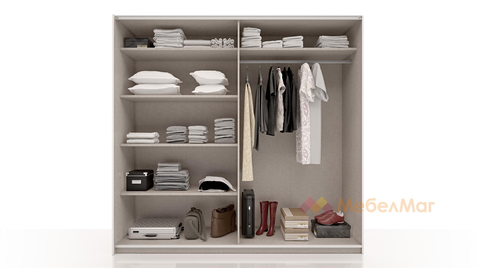 Той е двукрилен гардероб, който се отваря чрез плъзгащи врати. Модерният плъзгащ механизъм прави отварянето на вратите лесно, без да се тревожиш, че трябва да осигуряваш допълнително пространство пред самия гардероб. Щом ги отвориш, вътре ще откриеш пет големи рафта с оптимална височина и два лоста за закачалки.